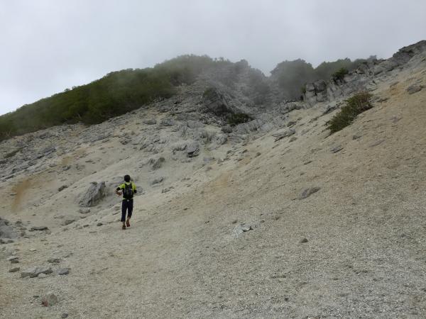 樹林帯は途中にある鳳凰小屋くらいまで。そこから先は視界が開けます。山頂付近は砂地の路面になっており、ソールでグリップしても滑るので、しっかりと踏ん張りを効かさないといけないので疲れます。