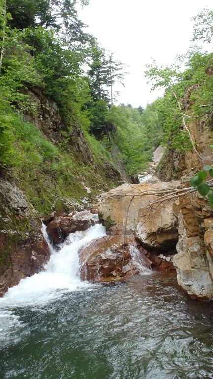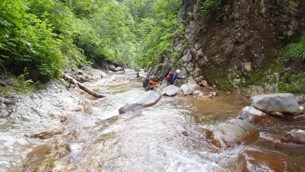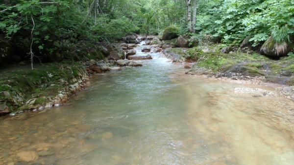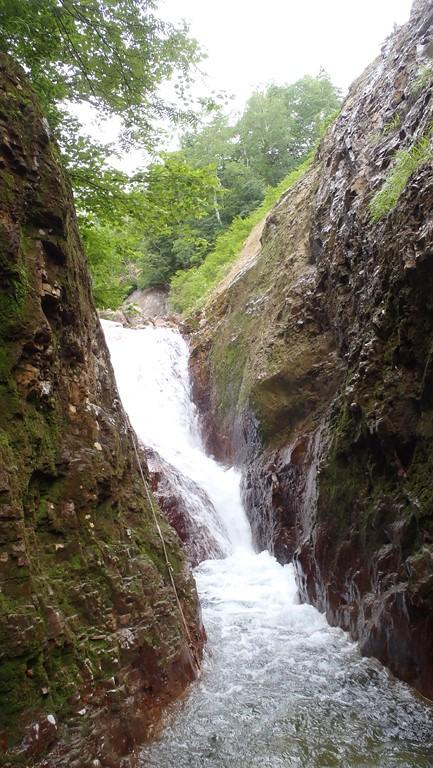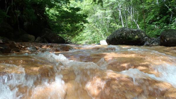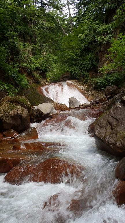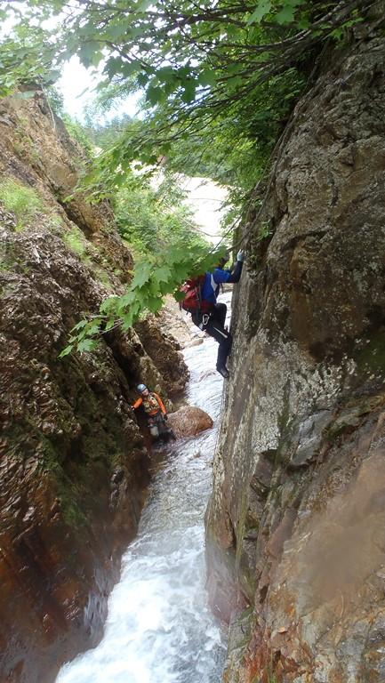 - 国道から林道に入ってすぐにゲートで、入渓まで40分くらい林道歩きです。ゴーロが少し続きその後はナメや小滝がコンスタントに出てきてコンパクトながらも綺麗で楽しめる渓相です。800mに滝を持ったゴルジュがあり、フィックスロープがありますが、中を行くことも出来ます。ほかは特段困難箇所はなく、快適です。