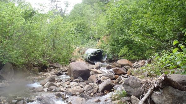 - 林道ゲート(40分)林道終点=入渓地点(3時間)土管=遡行終了(1時間)宝来小屋(1時間)薄別林道ゲート