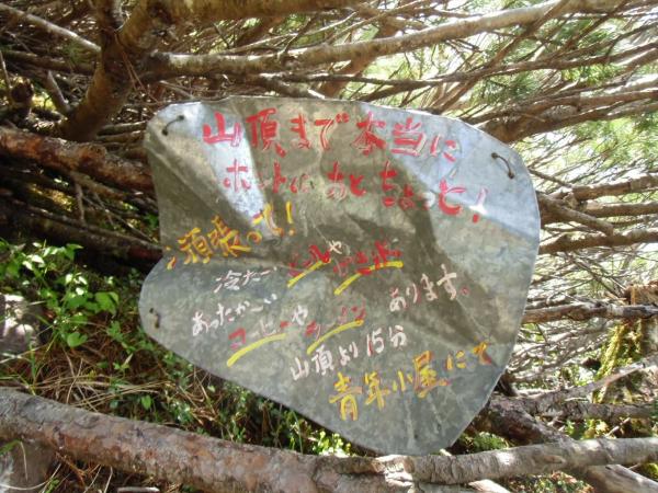 頂上手前の岩っぽいのは少しきついですが、ガンバレ看板に励まされて頂上へ!