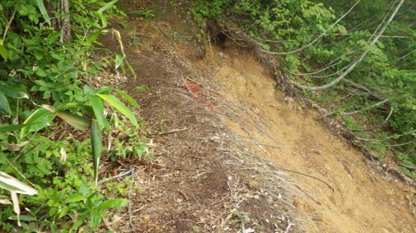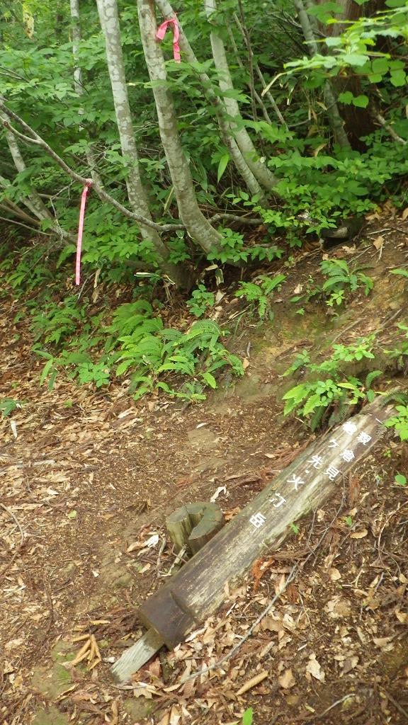 道標が倒れている箇所があります。ここを右折して下さい。踏み跡はしっかりしています。ここからすぐに崩落している斜面が出て来ますので、慎重に歩きましょう。