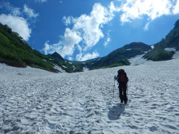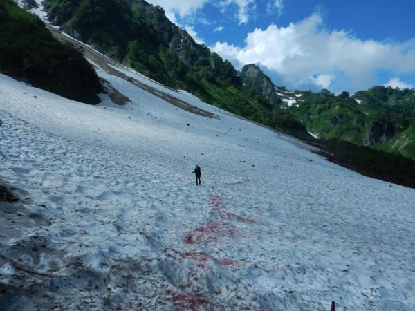 ゆるい斜面のトラバースをいくつかこなした後、白馬鑓温泉直下の雪渓(標高差200m弱)を直登する。軽アイゼンがあったほうが安全快適に登れる。