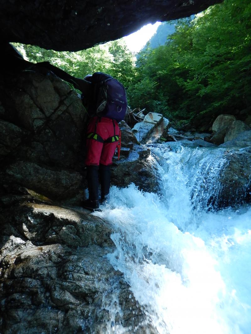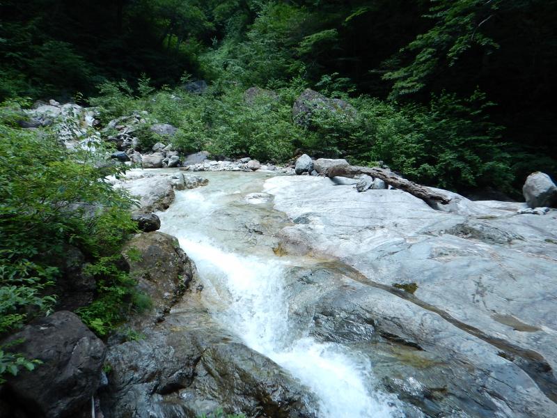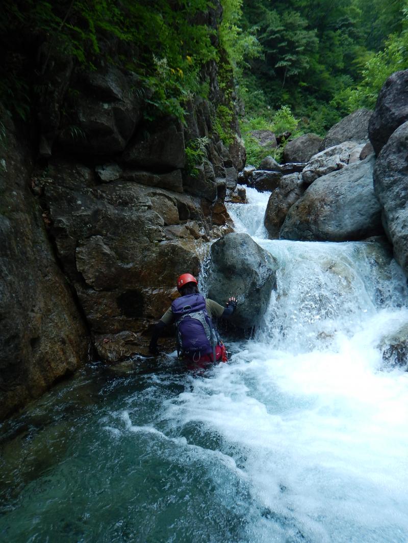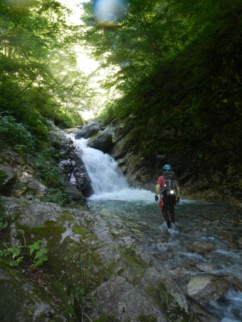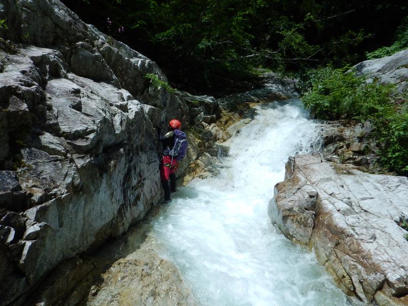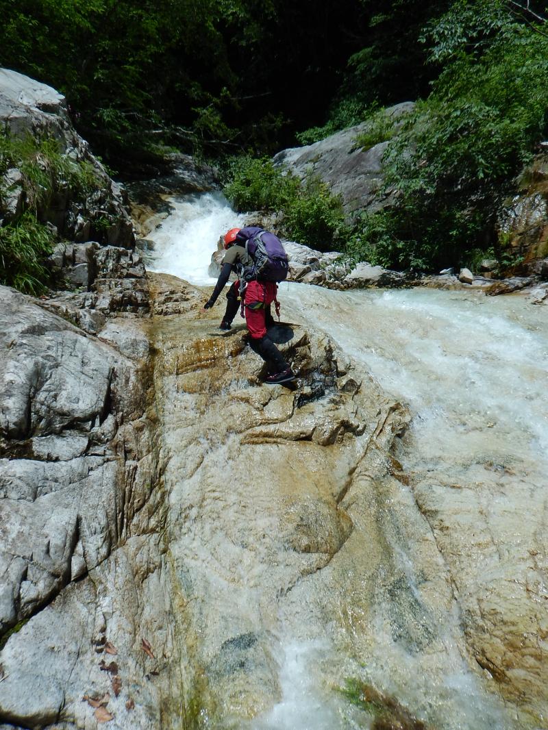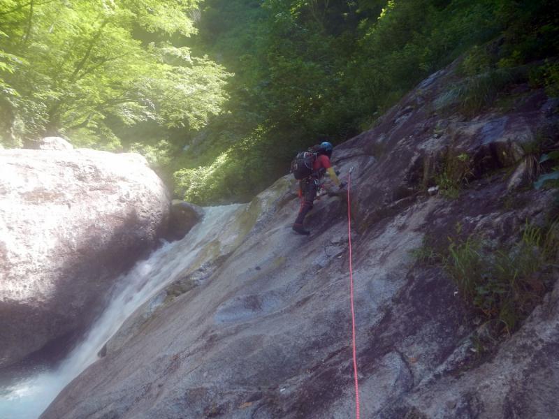 途中3mほどの滝の左岸をトラバースする箇所にボルト連打されていましたが、ツルツルのスラブでかなり悪く、結局高巻きました。