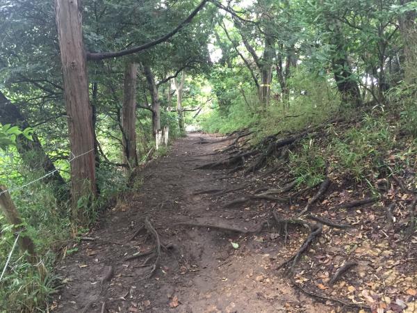 ハイキングコースはすごく歩きやすいので、ランでも当然走りやすい場所です。雨がパラパラと降っていて蒸し暑い感じでしたが、少し樹林の木陰に入ると風も通り案外心地よい