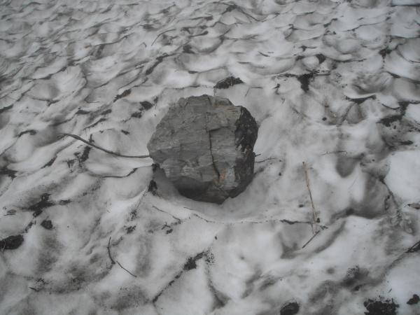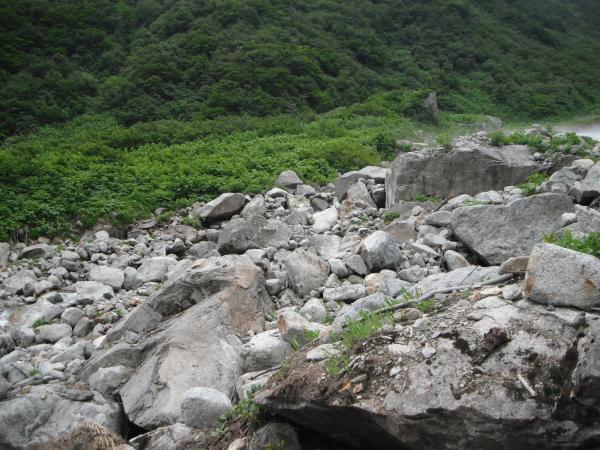 •石転び沢の下部は既に雪渓が崩壊していたので、残っていた門内沢の雪渓を渡り、石転び沢を徒渉しました。水量の多い場合、苦労しそうです。