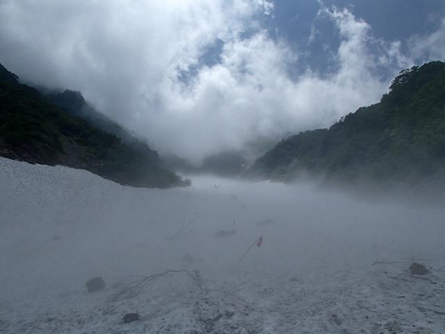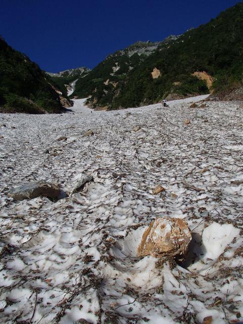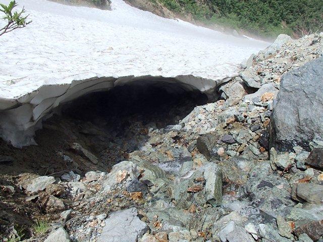雪渓の両端は雪庇のようになっていて抜けますので要注意。