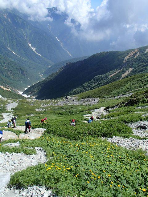 この日は登りの雪渓箇所で強風が吹き、雪面からの風は非常に冷たく、大気からの風は生ぬるく、(薄手の)上着が必要です。