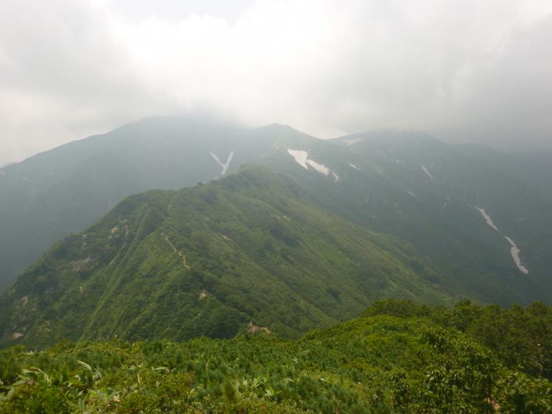 古寺山に着いてやっと目の前の展望が広がります。小朝日岳と雲に隠れた大朝日岳が見えました。直登と巻き道がありますがそのまま直登へ。小朝日岳から先は急な下り坂です。鞍部へ下りるとそこから先は風の強い稜線の道です。さっきまでのほてった体には大変涼しく感じました。朝日連峰で一番美味しいと言われている銀玉水は確かに一番冷たくて最高の味でした。
