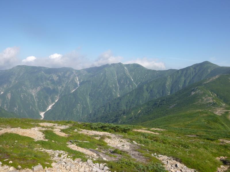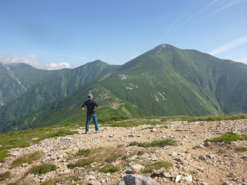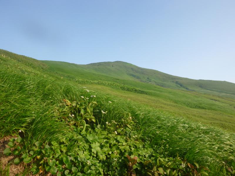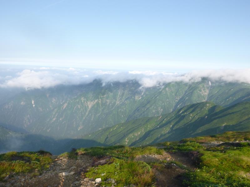 3時。すでに準備を始める方たちがいました。今回、朝日岳から朝日を見る、というのが隠れた一つの目標でしたので、自分も外の様子を気にしましたがまだガスっていました。結局、朝日は見れず、とりあえず水を補給するため往復20分の金玉水へ出かけました。水場へ向かう途中だんだんと日が射してきて雲が取れてきました。ふと見上げると完全に雲が取れた中岳の姿が!広大な緑の草原が続く山肌の光景に圧倒されました。
