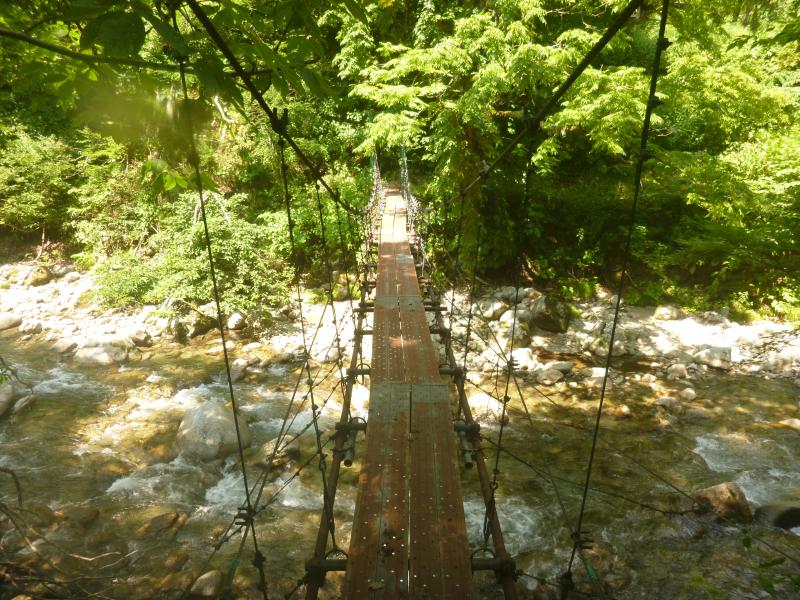 標高1000m以下になってくると樹林帯の中の気温がさらに上昇、風も通らないためまるで蒸し風呂。灼熱で風もなく下りれば下りるほど温度が上がるという蒸し風呂地獄状態?(笑)先ほどまで天国のような稜線を歩いていたのに・・。これに追い討ちを掛けるように始まった、上倉山から先の激下り坂。もうカメのようにのんびり下ります・・・。このコースを上りで使うと大変なことになりそうです。実際、登ってくる登山者は一人もいませんでした。必死の思いで下りきり、吊り橋を2ヶ所渡ってゴールの朝日鉱泉へ。