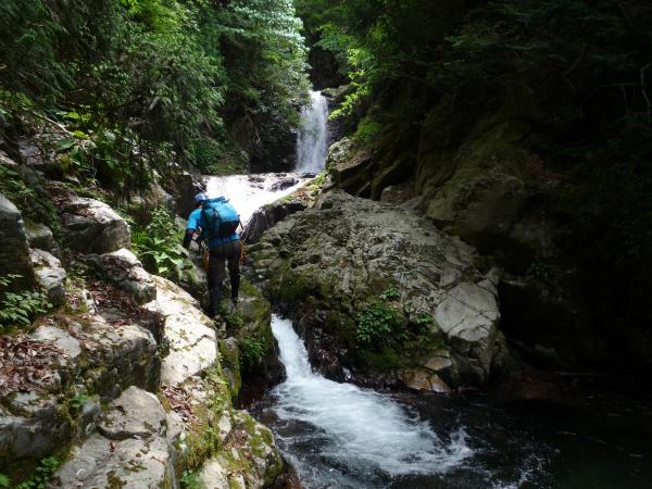 元越谷は神戸・大阪からもアクセスが良く、コンパクトな沢の中に美しいナメ、エメラルドグリーンの釜、ミニゴルジュ、小滝があり登り・泳ぎ・へつりが楽しめ沢の醍醐味が詰まっています。今回は仙ノ谷の分岐から少し進んだところ沢が細くなる前に引き返し、仙ノ谷から林道に上がりました。