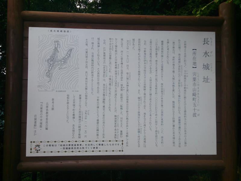 長水山城…播磨の中世といえば赤松氏ですが、ここも赤松則祐が、本城である白幡城の北の護りとして築き、一族の広瀬氏を配しましたが満親のとき嘉吉の乱に遭遇、赤松宗家に与した広瀬氏は没落し、その後、応仁の乱における活躍で播磨守護に返り咲いた赤松政則は一族の宇野氏を西播磨守護代に任じ長水山城主としたのが始まりと言われています。