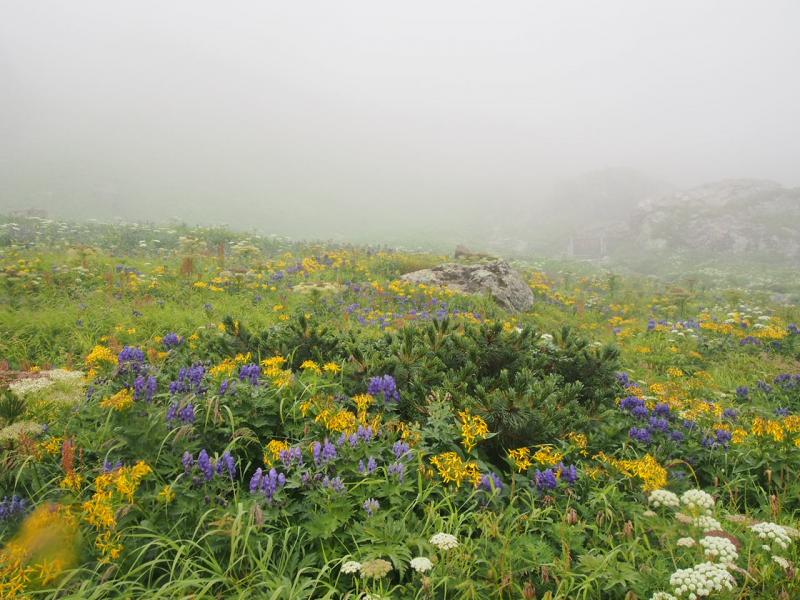 大雪渓までは良かったのですが、稜線付近ではさっと降られました。でも白馬頂上宿舎直下の花畑で癒されました。トリカブトやコオニユリ、ウルップソウ、チングルマの実など秋の花が沢山咲いていました。もう北アルプスは秋に変わりつつあります。スカイプラザからは素晴らしい景色が見えるはずですが、天気も天気なので。。。ケーキセットでコーヒータイム♪