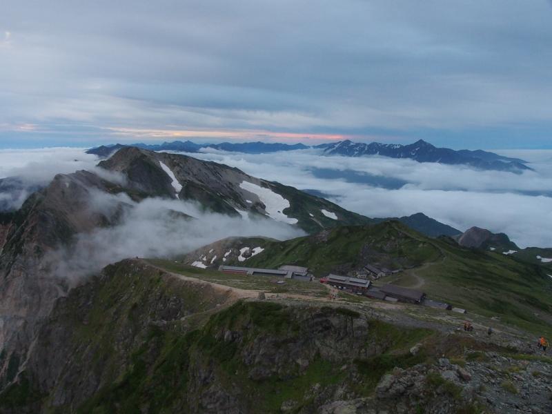 そして2日目。風は少しありましたがなんとか天気は回復し、山頂からは立山、剱岳はもちろん槍ヶ岳、穂高岳までも見渡せました♪ただ雲が厚く、ご来光はしっかりと出てきませんでした。あとは小屋に戻って腹ごしらえして、お待ちかねの稜線歩き♪白馬三山はとても歩きやすい稜線が続き、展望も良いのでいつまででも歩いていられそうでした。そして鑓温泉に下ります。途中も花畑があり癒されます。鑓温泉では足湯だけ入りましたが次はテント泊でもして露天風呂に浸かりたいですね。鑓温泉から下は意外と長いのでもうひとがんばりです。