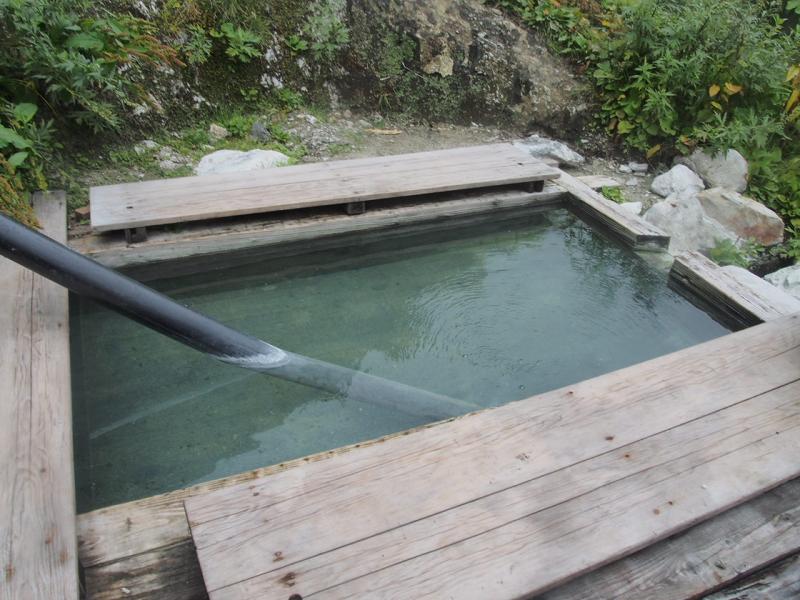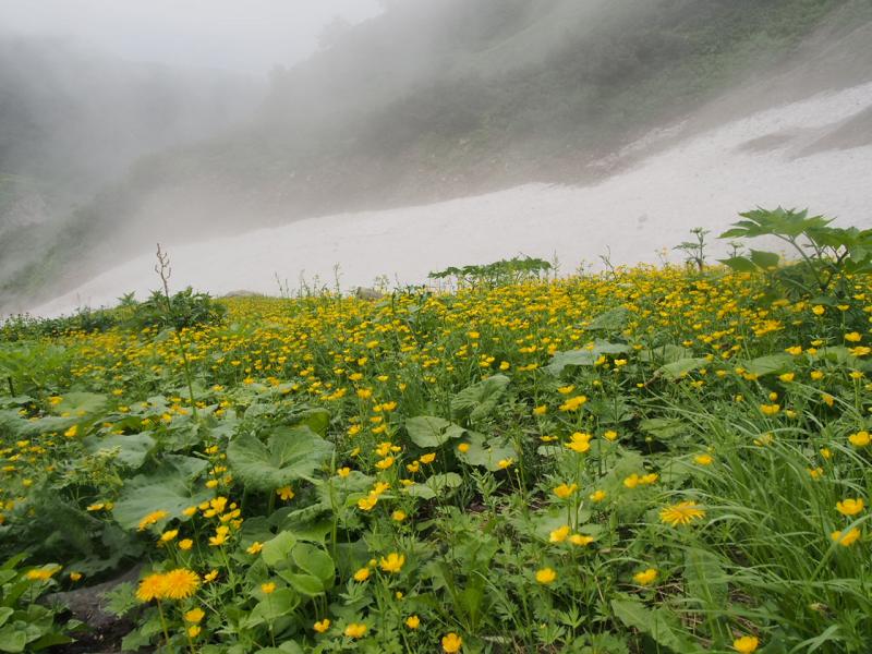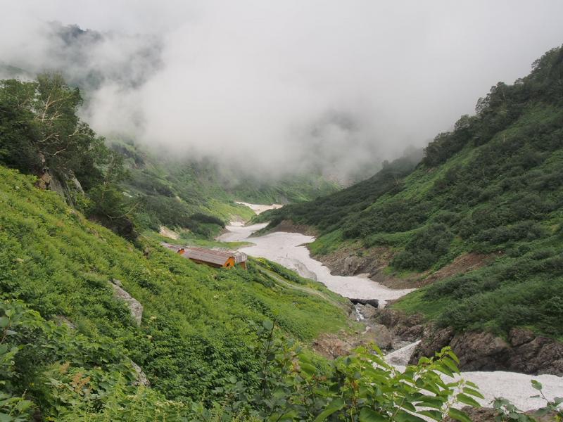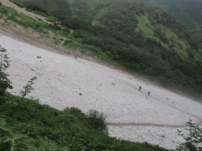 鑓温泉の下に傾斜の緩い雪渓あり。心配な方はアイゼンを装着すると良い。