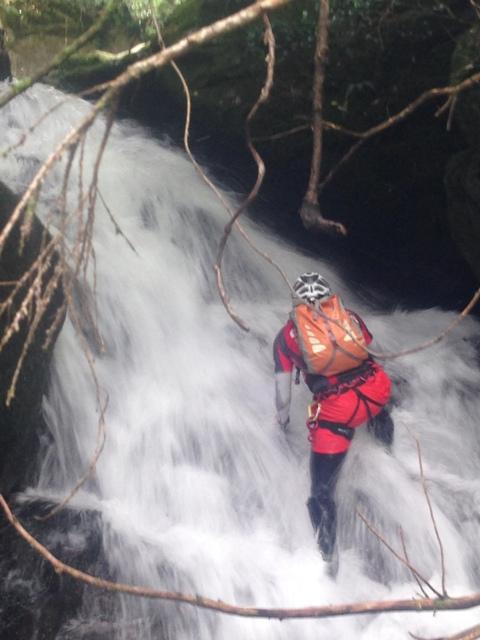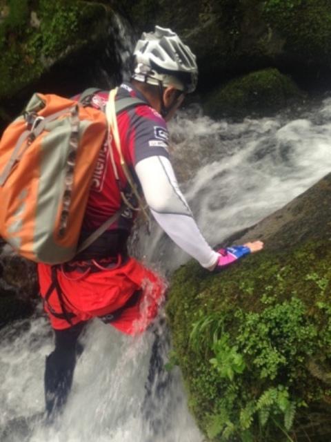 次に出てきた滝にはハーケンが2本打ってあったものの水量多し&足元滑る、ゆえにトップ以外敢え無く敗退。高巻く。しばらくして砂防堤と2回出会う。ここは左側から高巻くルートがあります。砂防堤を越えると2~3mの小滝が程よく続く。がしかし、やはり私はこの水量に腰が引き気味。2回お助けロープを出してもらいクリア。