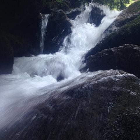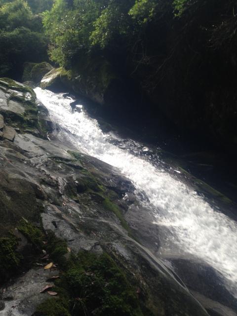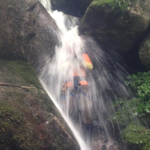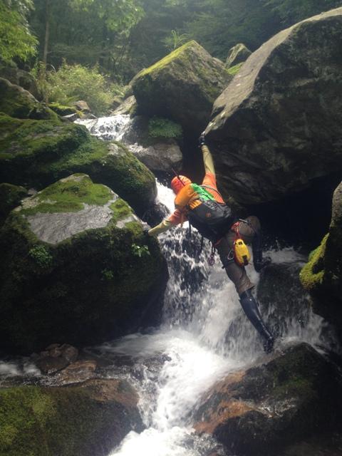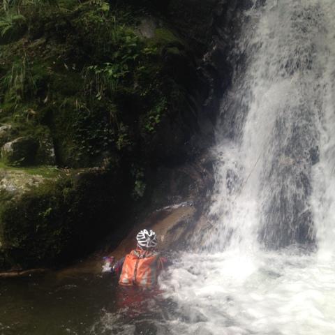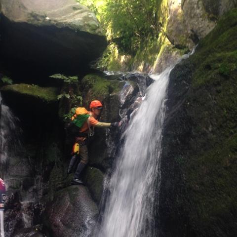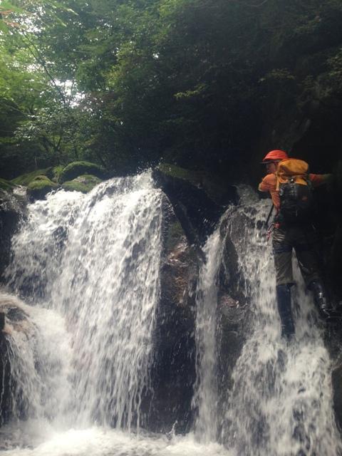 と、その先に5mの滝。やはり水量が多くなかなか手強い。トップはなんとか登り切りロープを出してもらう。本日沢登初体験のアルバイトさん。果敢にも挑戦。手の置きは足の置き場さぐってさぐって、、、2.3回滑る。“大丈夫-?巻く-?”“あと1回行ってみます”でそのLASTの挑戦で見事にクリア!パチパチ。それを見ていた私、素直に高巻く(笑)