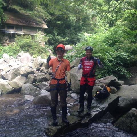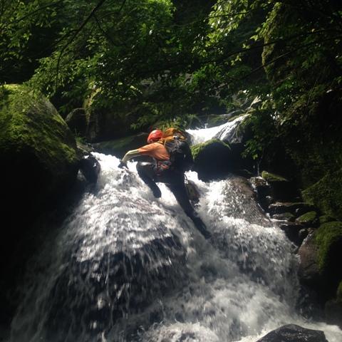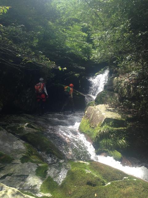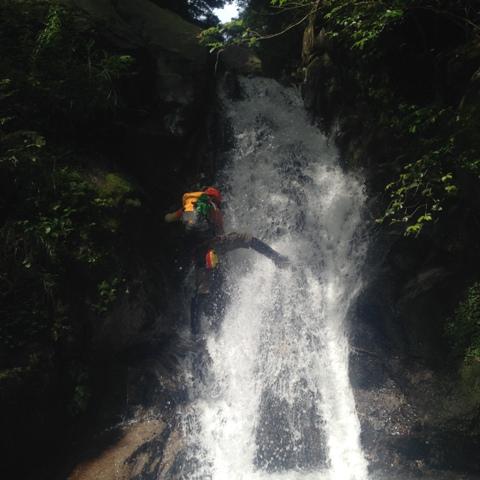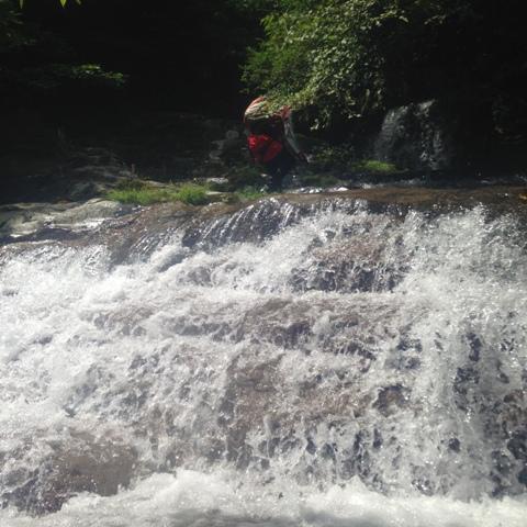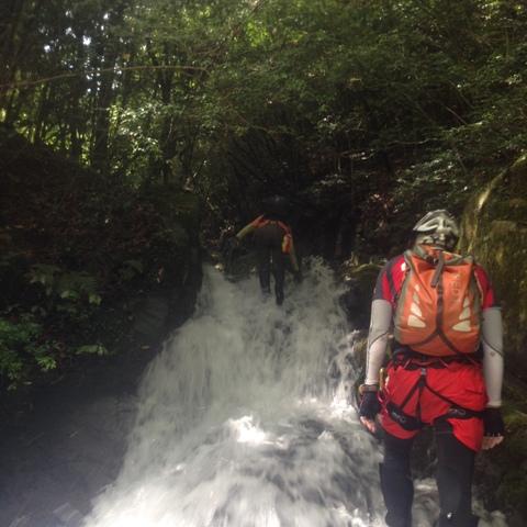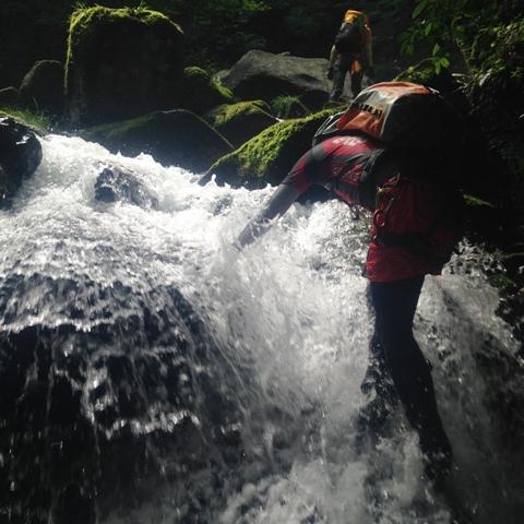 入渓は坊主ケ滝を巻いた先から。この滝を上ると足が腫れるという言い伝え(?)に習いここは登りません。入渓してすぐ小さな滝。すでに勢いのある水量に押し戻されお助けヒモのお世話に。その先に現れるのは9mのすべり台。小屋脇にあるなめ滝は格好の遊び場。男性陣は大はしゃぎで滑り降りるも私は怖いので遠慮させていただきました(笑)