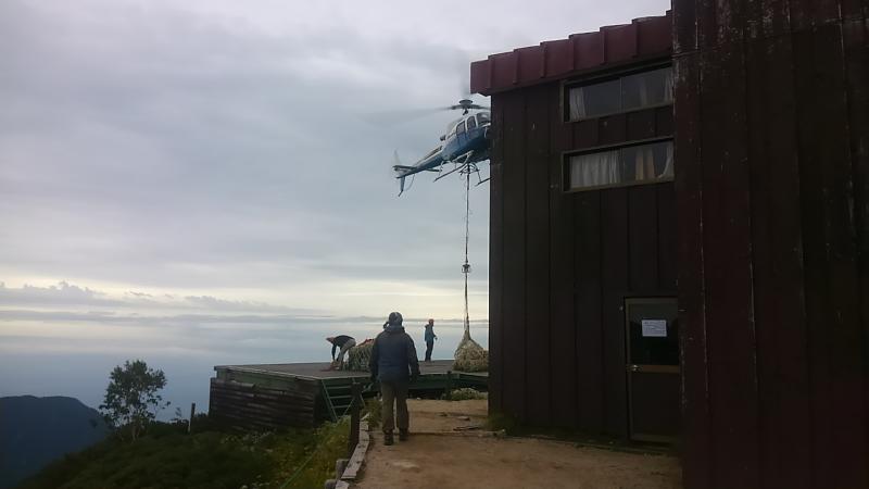 お天気の関係でヘリでの荷揚げが遅れていたらしく、翌朝にその場面に遭遇しました。