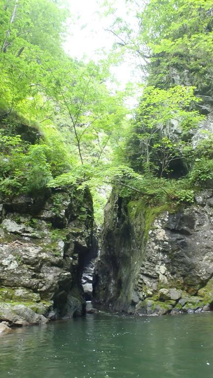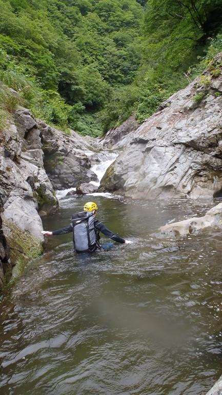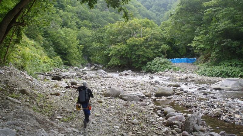 須築橋から3時間ほどの河原歩きをこなすとワクワクドキドキする圧巻のゴルジュ地帯がはじまります。ゴルジュ、釜、滝、雪渓、泥つきの高巻き・・・核心部のS字峡には全てが凝縮されていました。核心部の通過時には短時間でしたが雨も激しく降り、泥だらけになりながらの遡行はなかなかシビアでした。降雨の影響もあり、初日は予定よりも進むことができませんでしたが、テン場では焚き火も出来て静かな夜を過ごすことができました。