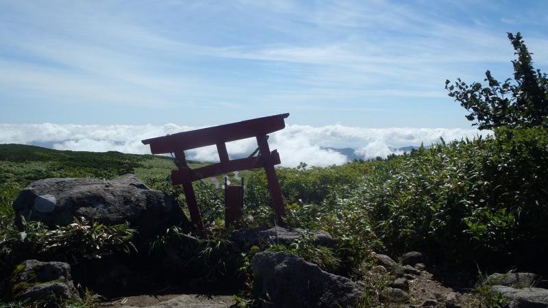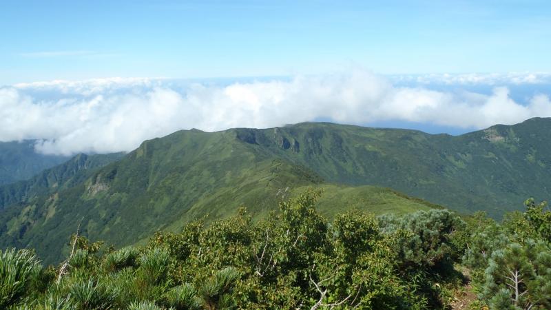 一般登山道のルートだが、頂上から登山口まで10kmとやや長い。展望は良く、下部は見事なブナ林で申し分はないが、熊糞が至るところにあり、クマには要注意!