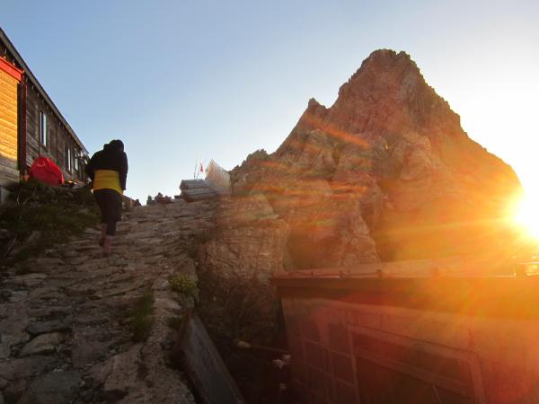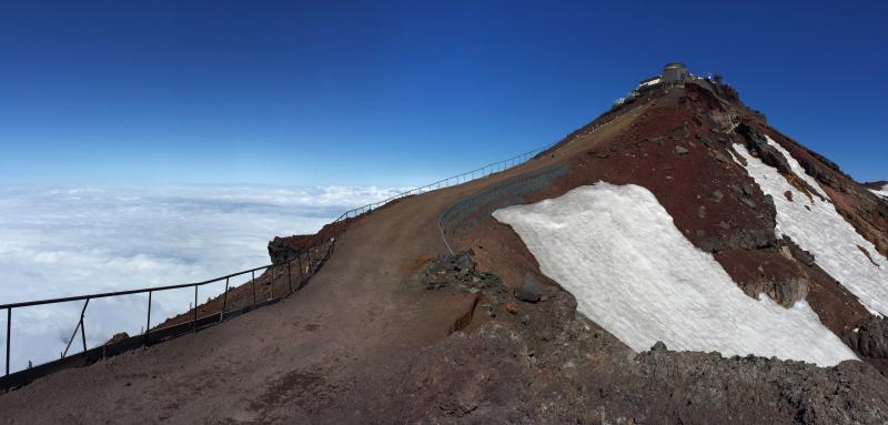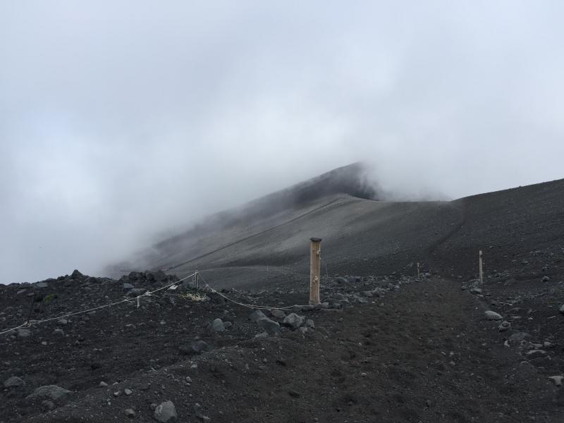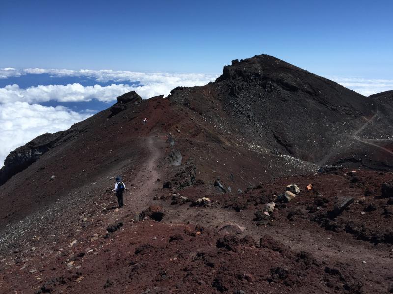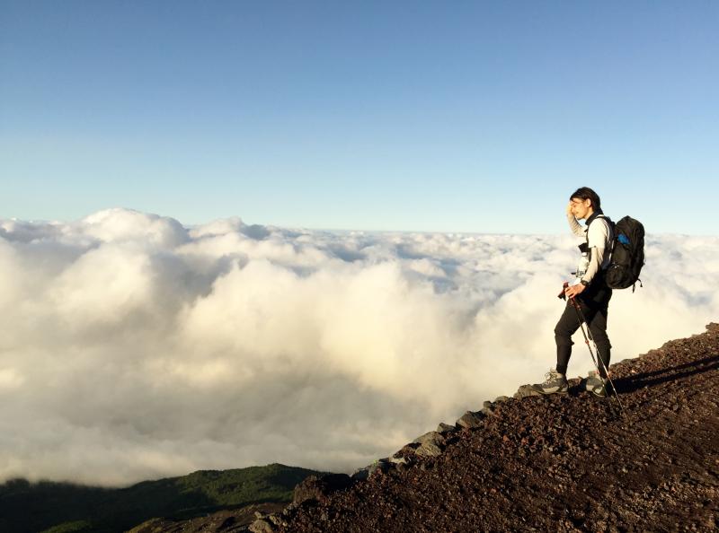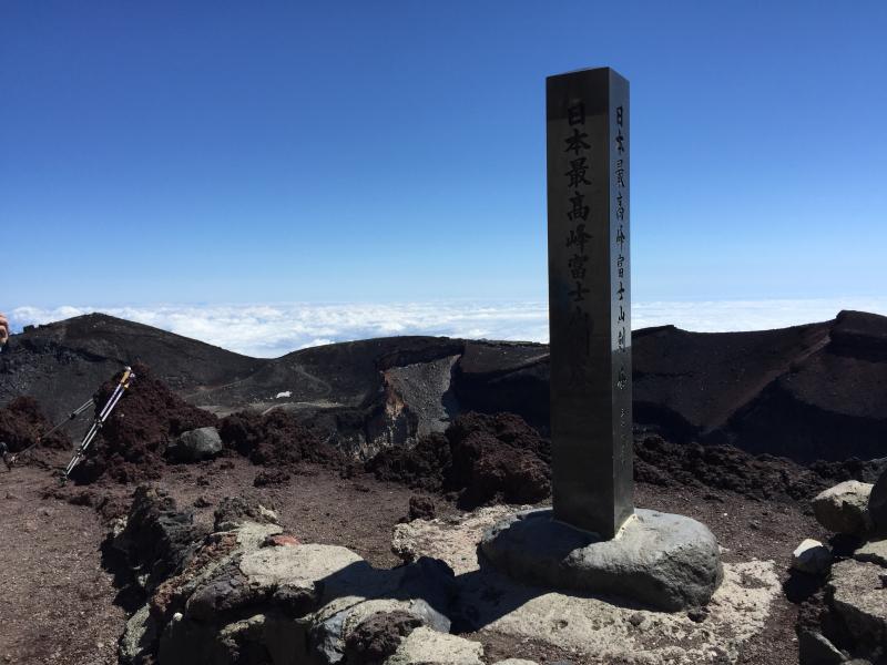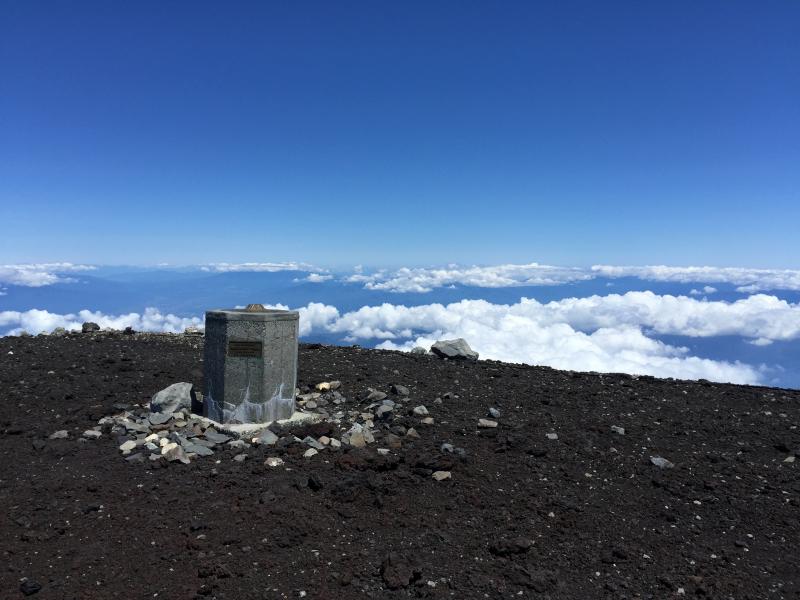 6合目以上は常に雲海の上。そよ風程度。残雪がなかったのでかなり暖かく、二人とも高山病の症状は全く出なかったので終始快適でした。