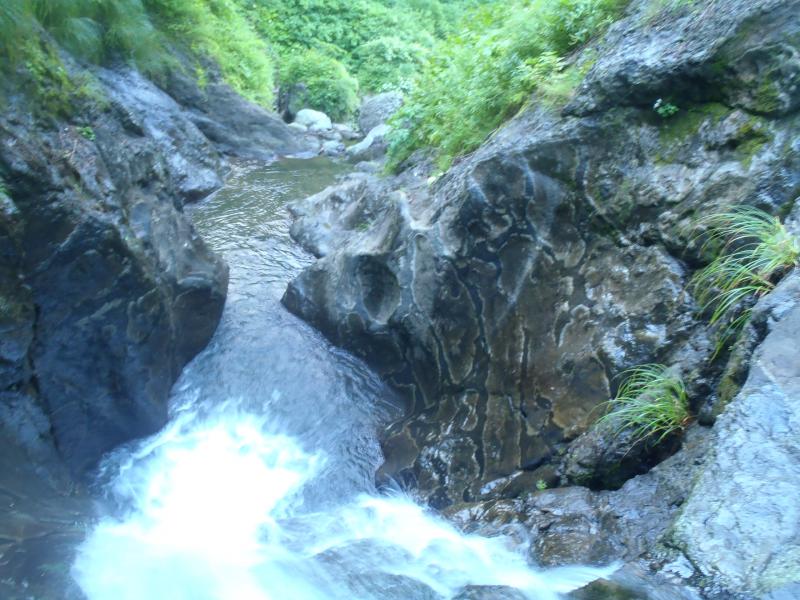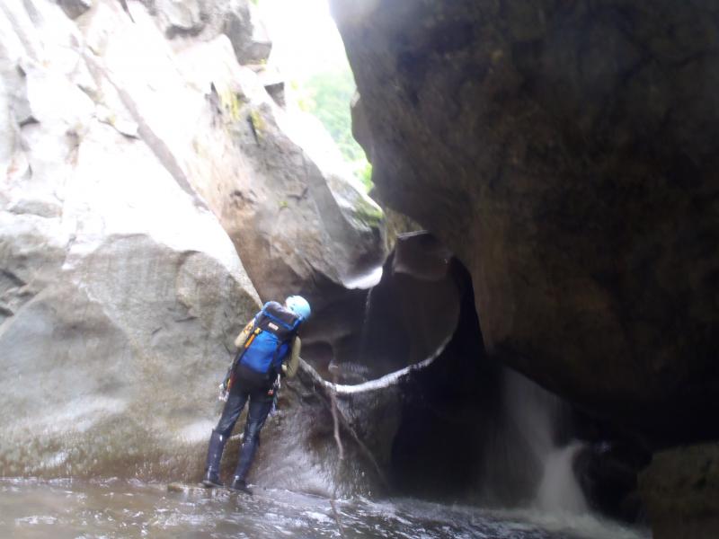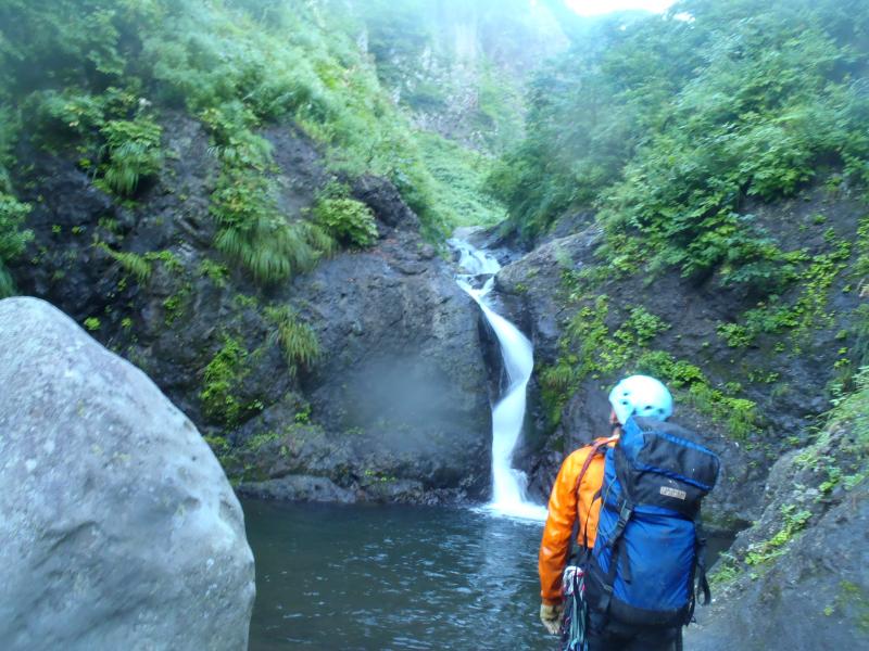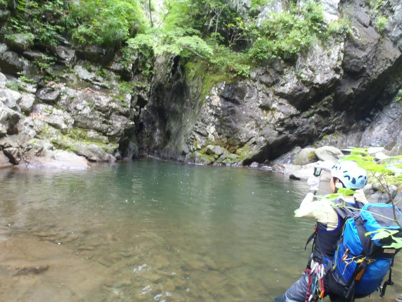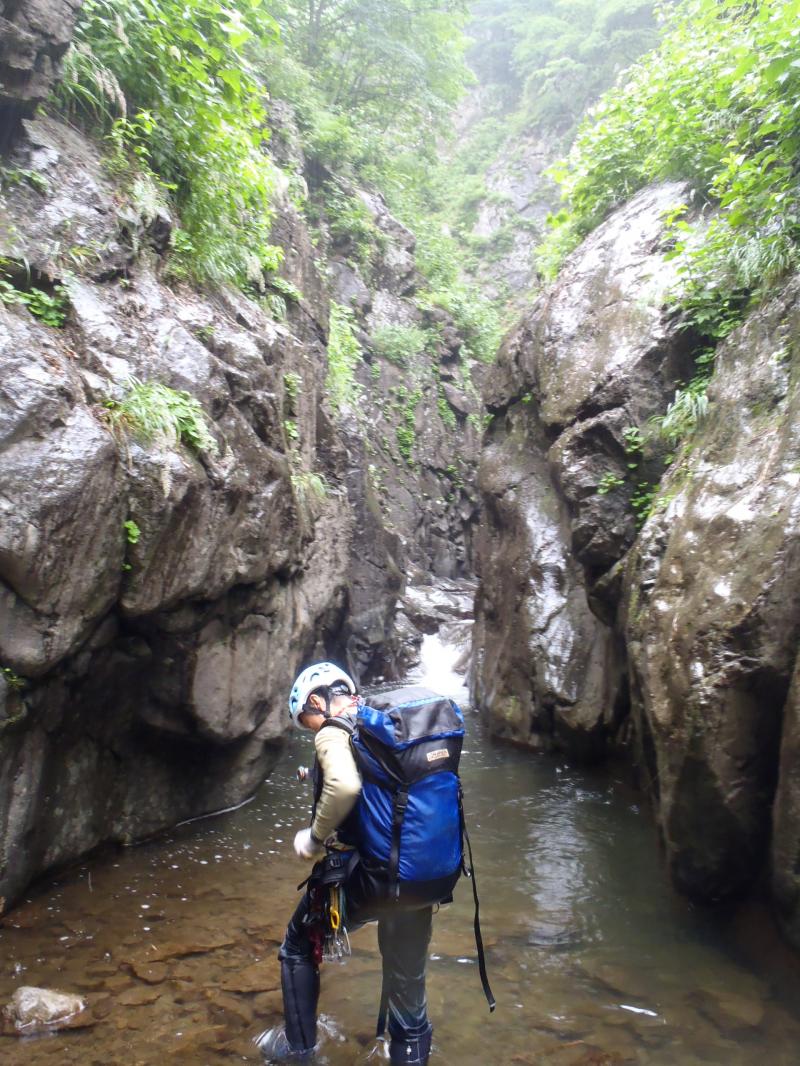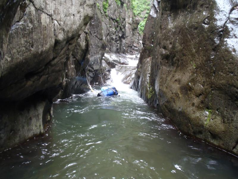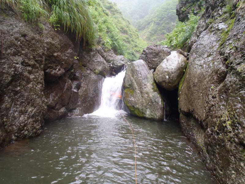 次第に沢も開けてくると5mハングのF9が現れます。ここは空身で泳ぎ水流に耐えて中を突破しました。