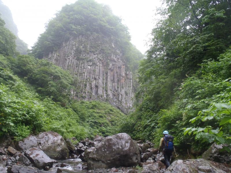 そして再び静かな渓相となり、420m二股で大きな柱状節理にぶつかります。
