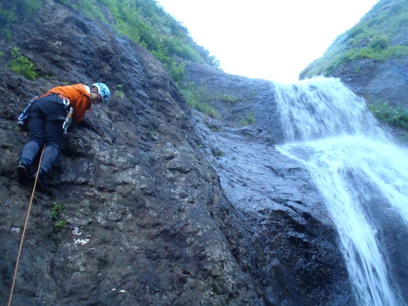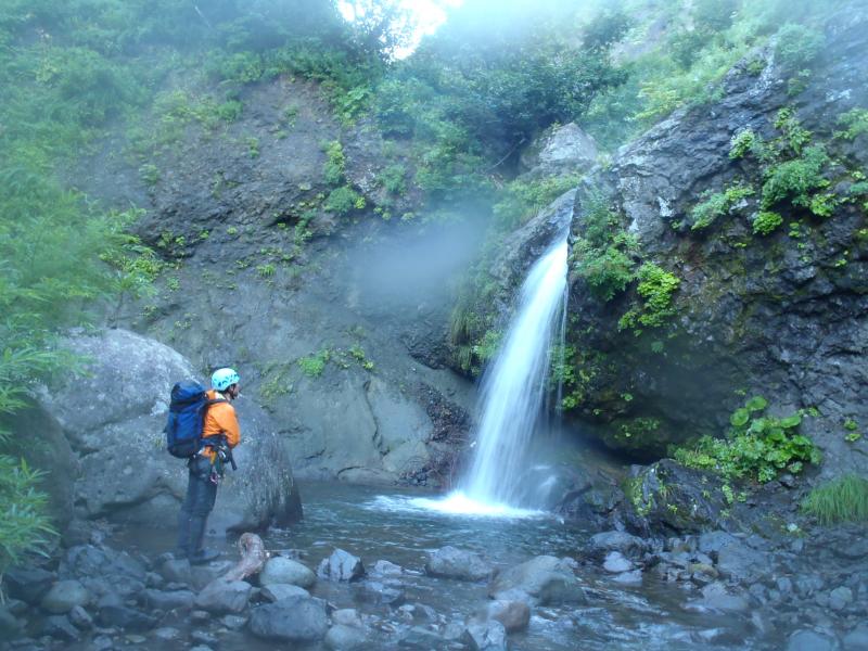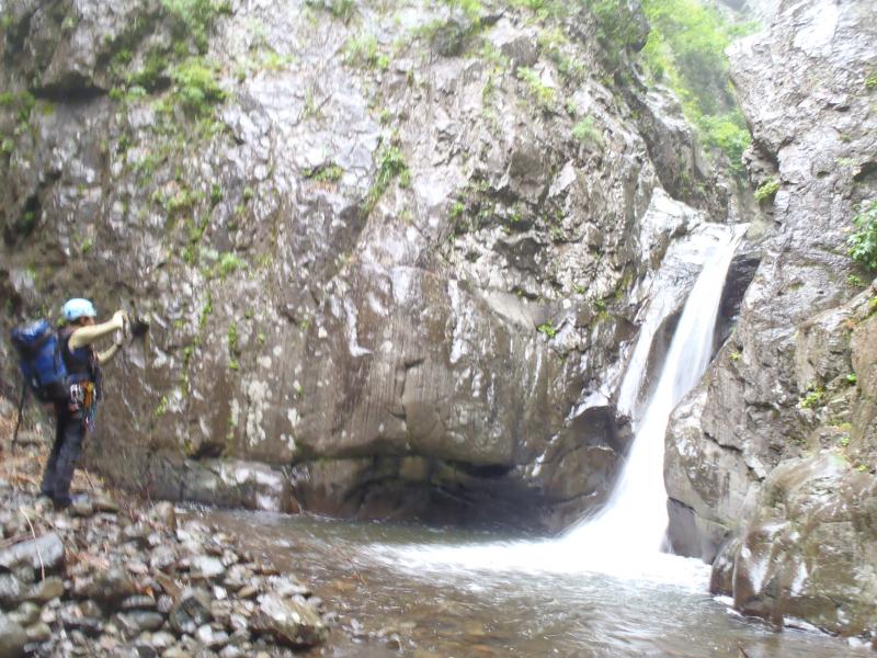 翌日は朝からいい天気15mハングの滝の高巻から始まります。右岸を微妙なトラバースをし次の滝を直登し20mの大滝が現れます。ここは右岸を登りますがそんなに快適ではなかったです。
