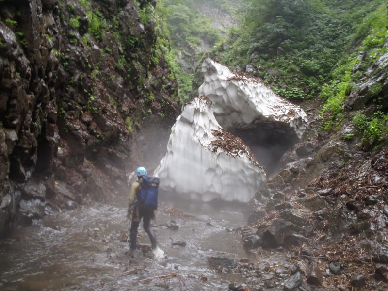 幾つかの釜滝を超えて行くと大きな雪渓が現れます。一部微妙な残り具合をしている箇所もあり緊張する場面でもありました。