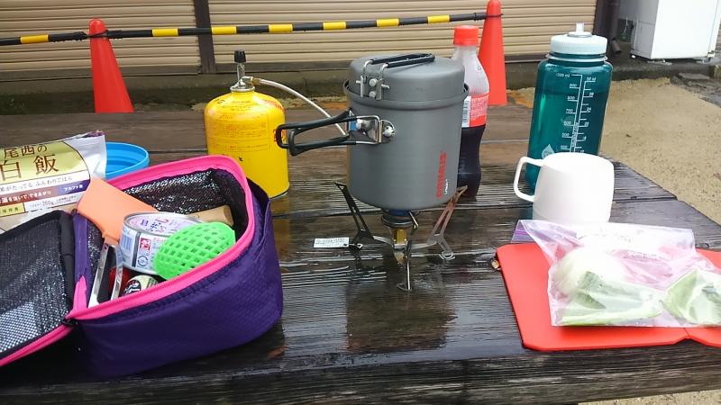 というわけでやってきました。私生活ではまったく料理をしないのですが、簡単に作れそうなもので好みのものに目星をつけて材料を買い、せっかくなので山頂で。