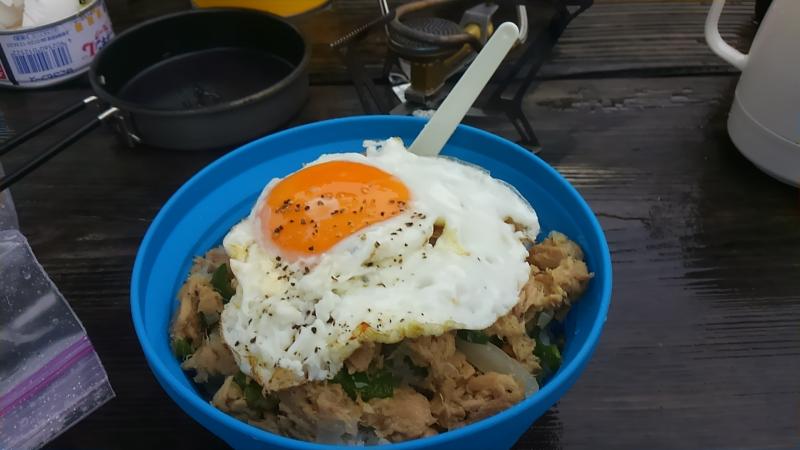 材料カット前にお湯で戻していたアルファ米を器に入れ、完成したツナ他炒めと目玉焼きをでーんと乗っけます。