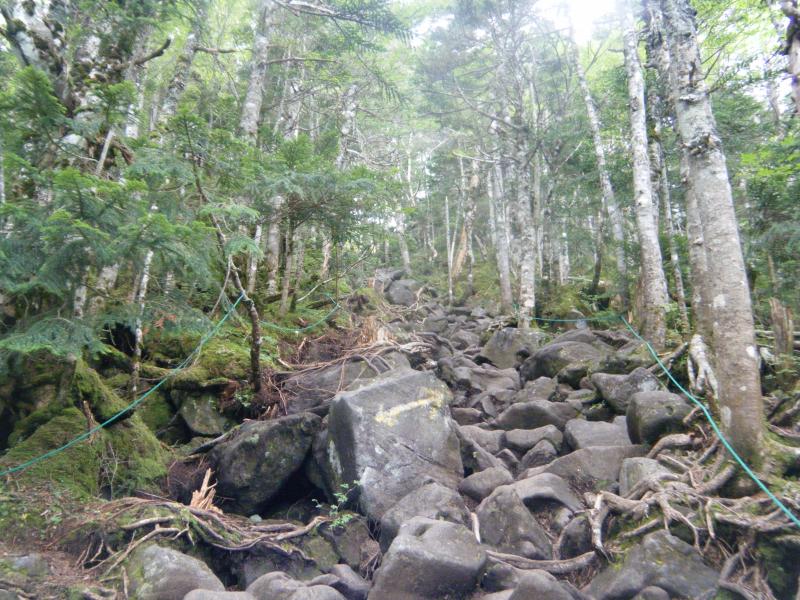 登山道にはけっこう大きい岩がゴロゴロとあり、蓼科山の周辺は油断禁物な状況で、少なくとも初心者でも楽に登れるイメージではなかったです。
