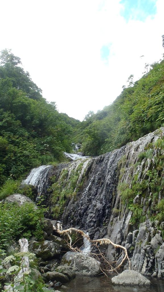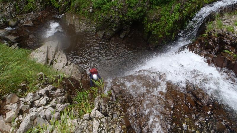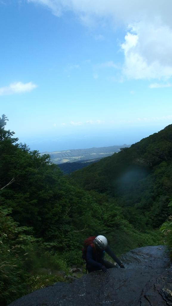 640m二股から開けた形相に順層の大滝が連なりますが、ロープなしで快適に登れますが初心者がいるときはロープを出しましょう。頂上へのヤブ漕ぎは積丹山塊にしては楽かもしれません。