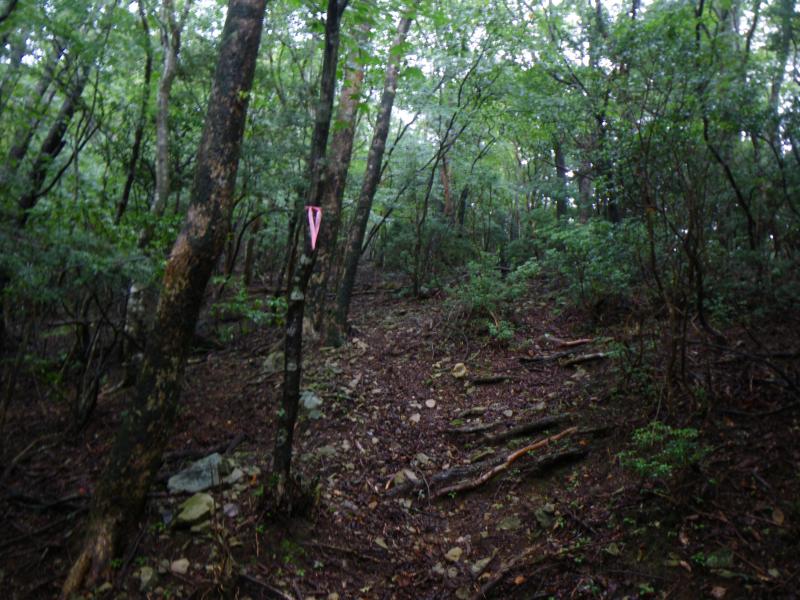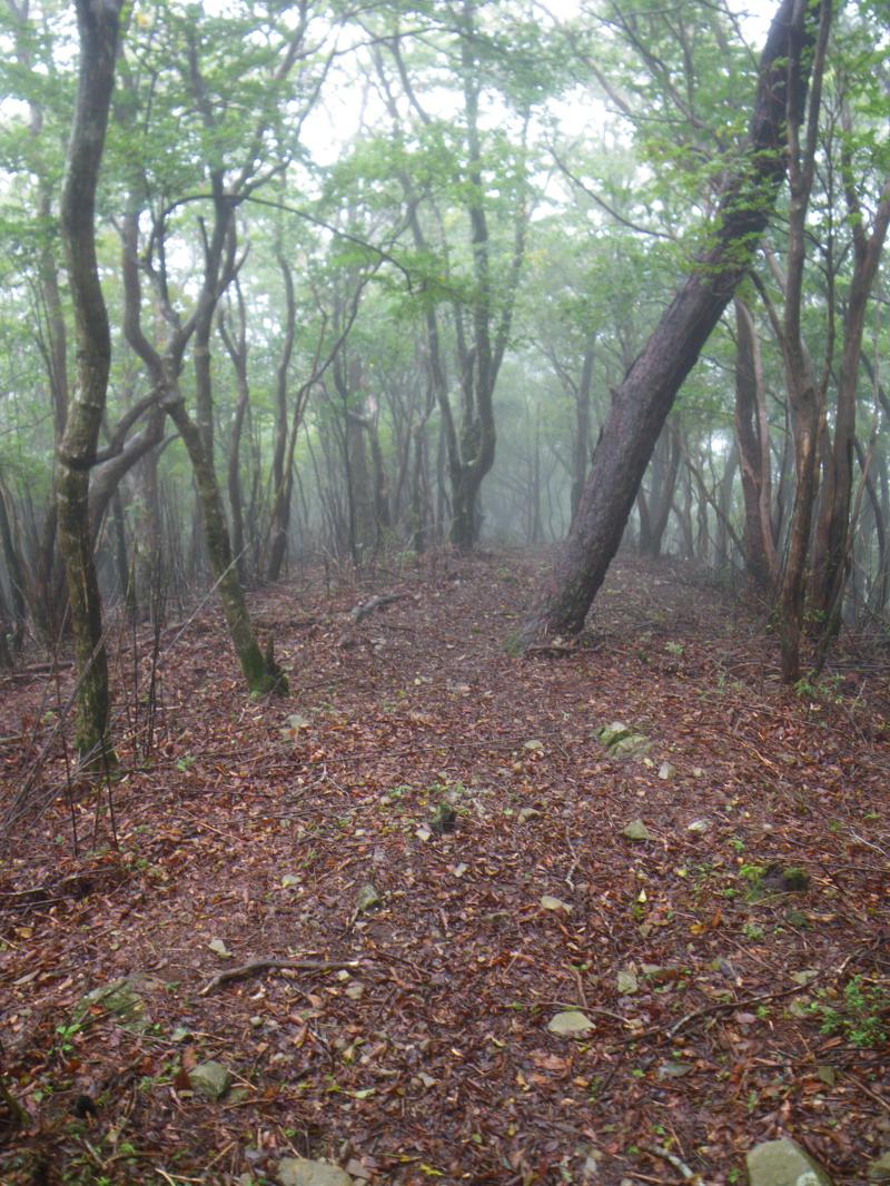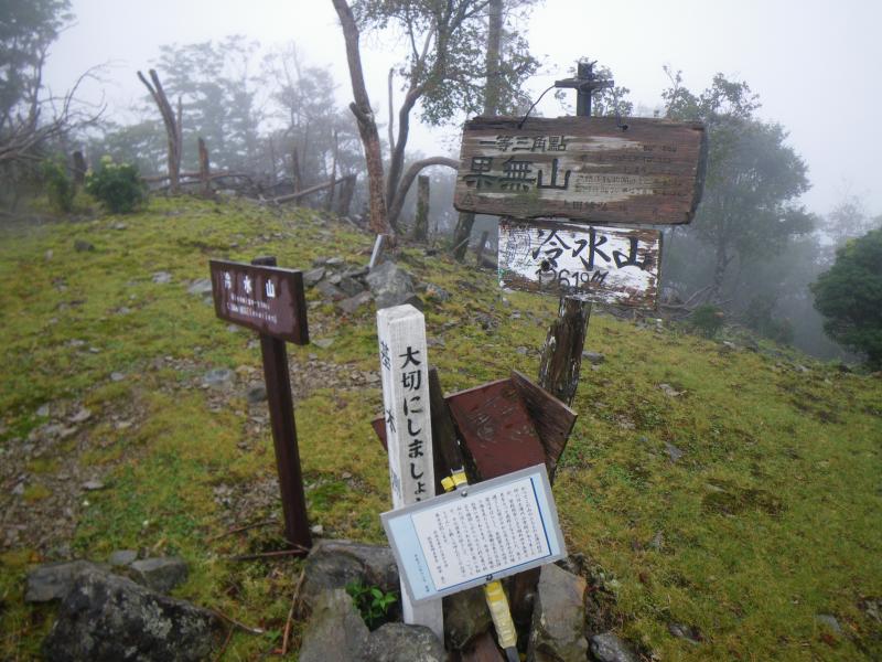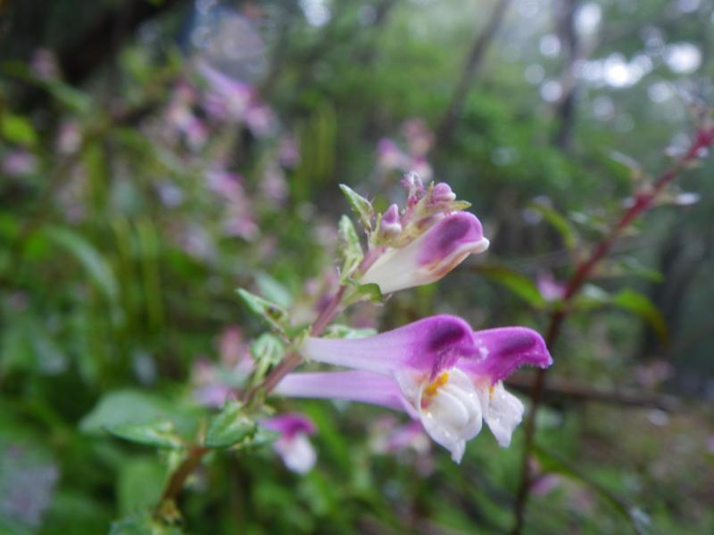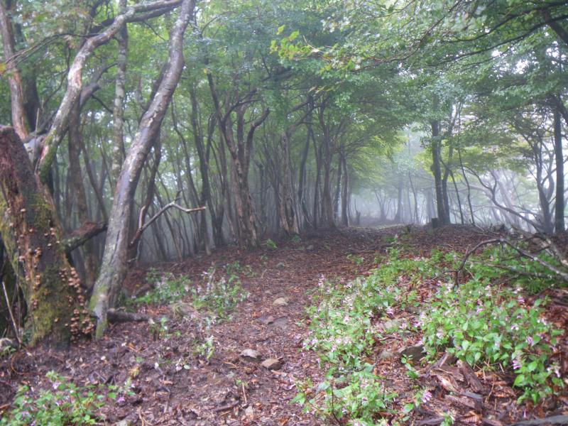 冷水山(ひやみずやま・1262m)は果無山脈の主峰で関西百名山の一つ。この果無山脈は護良親王(大塔宮)ゆかりの山 で、十津川へ逃走した際に使用した道とされ、安堵山(あんどやま・1184m)はその際にここまでくれば追撃の恐れがないだろうと安堵したのが由来だそうです。今では一部、広域基幹林道が走り、冷水山に関してはこの林道から登れます。この山は新・花の百名山にも選ばれているそうですが、その花のイワナンテンはわからずでしたが、稜線沿いはシコクママコナの群生がたくさんありました。今日は雨模様で林道からの景色も含め、本来は熊野の山が見えるはずでしたが、残念です。