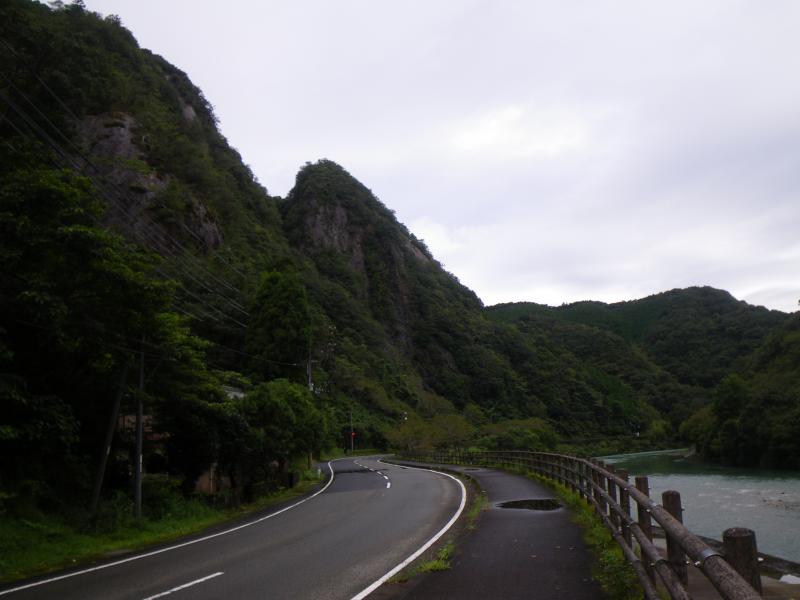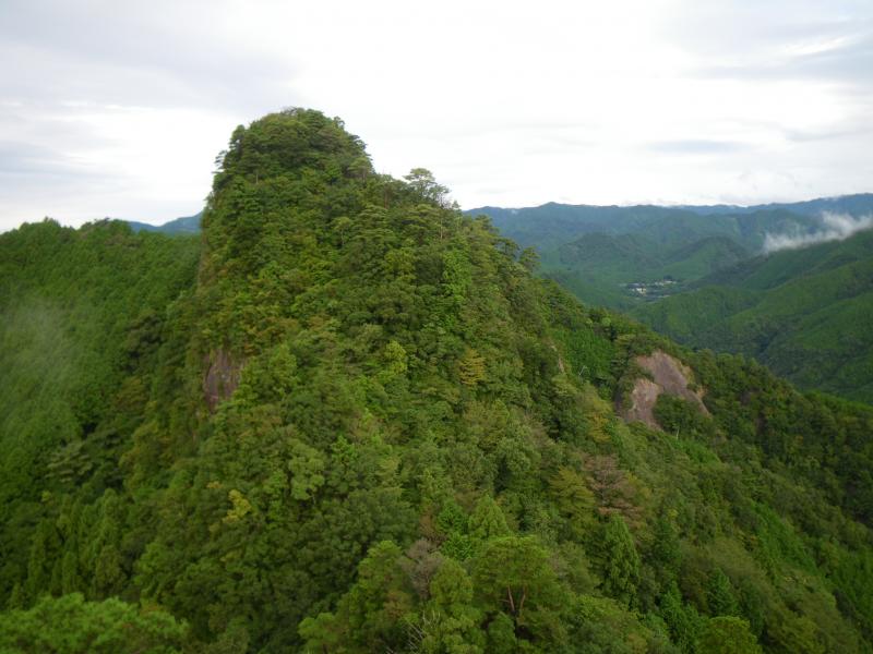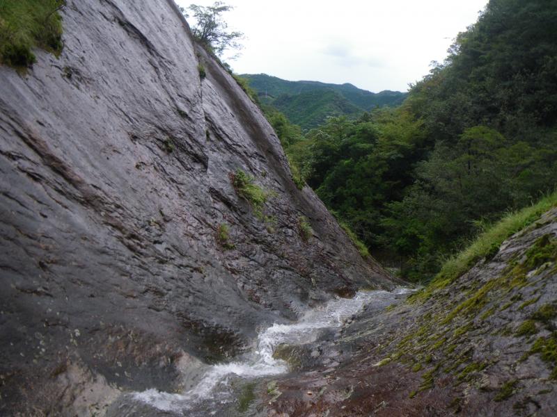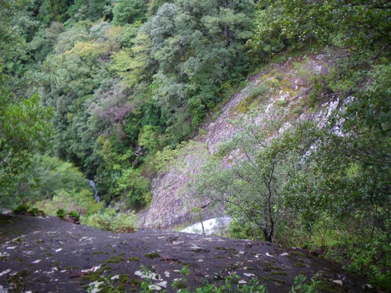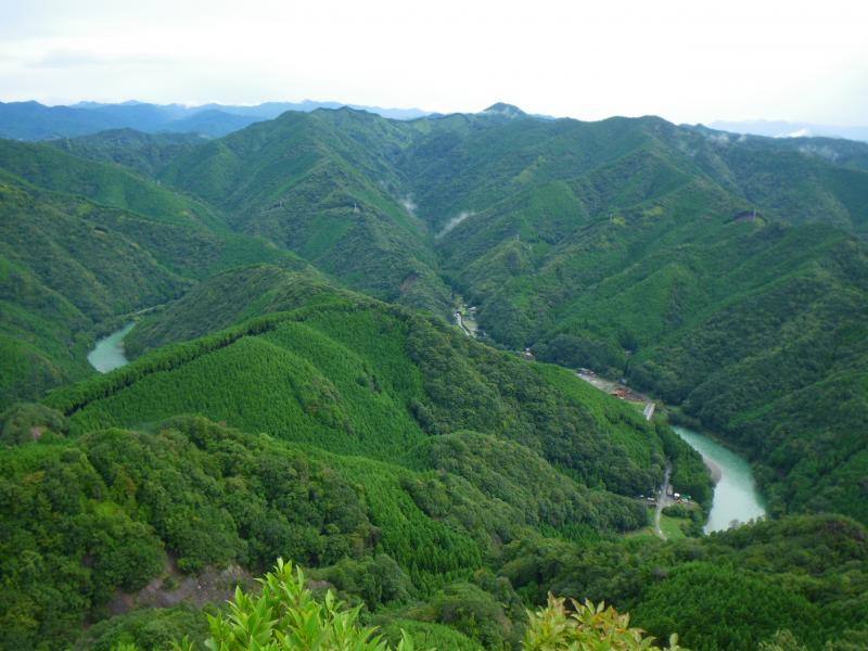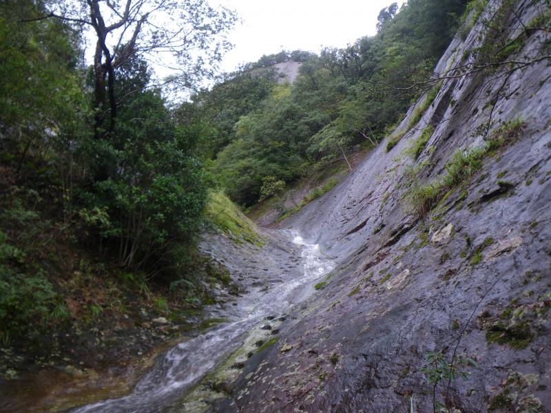 嶽の森山(だけのもりやま・376m)は古座川の天然記念物一枚岩の対岸にそびえ、、雄岳(上ノ峰)と雌岳(下ノ峰)の双耳峰で、低山ながら急峻な岩峰で形成されています。途中のなめとこ岩のナメ沢を歩く箇所は名所で面白いですが、雨天時は注意が更に必要ではないでしょうか。頂上からは下の古座峡や太平洋や南紀の山々が見渡せ、おそらくこれから向かう大塔山などが見えるはずですが、山が連なりすぎてわかりませんでした。大阪からはあまりに遠いですが、登りにきてもういいかなと思える低山でした。