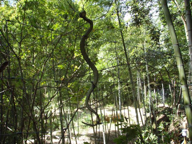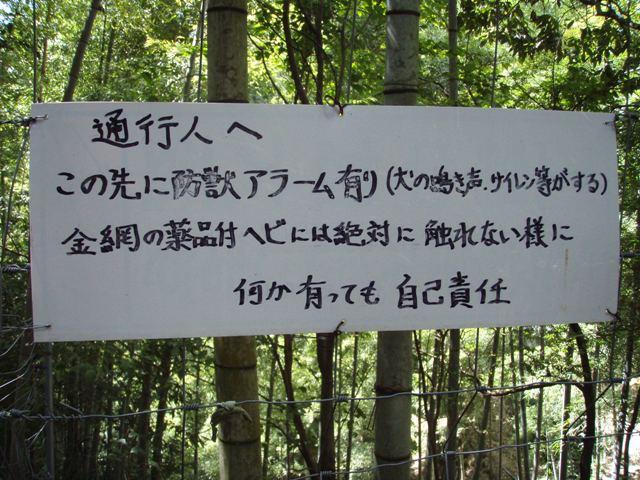 真ん中の道をどんどん進んで行き、お墓が途切れた所からようやく山道へ。しばらく行くと「通行人へ」という注意書きがあり、左手の柵にいろいろと仕掛けがセットされている旨が書かれていました。歩いていると害獣避けの電子アラームがいろいろ作動し、柵には絶対触らないよう書かれていた薬品付のヘビが何匹もぶら下がっていました。