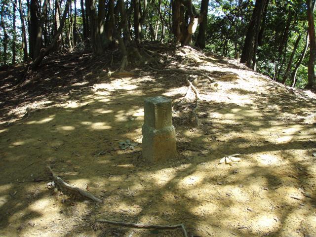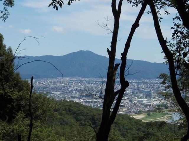 ゆるやかな勾配の山道をじわじわ進んで行くと、樹木の間から京都市内を望むことができ、この辺りは風が通って気持ちよく歩けます。桂坂の分岐から約30分で沓掛山に到着。三角点あり、展望は若干有り。気温25度。