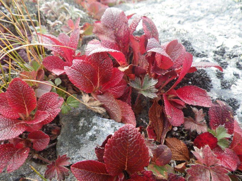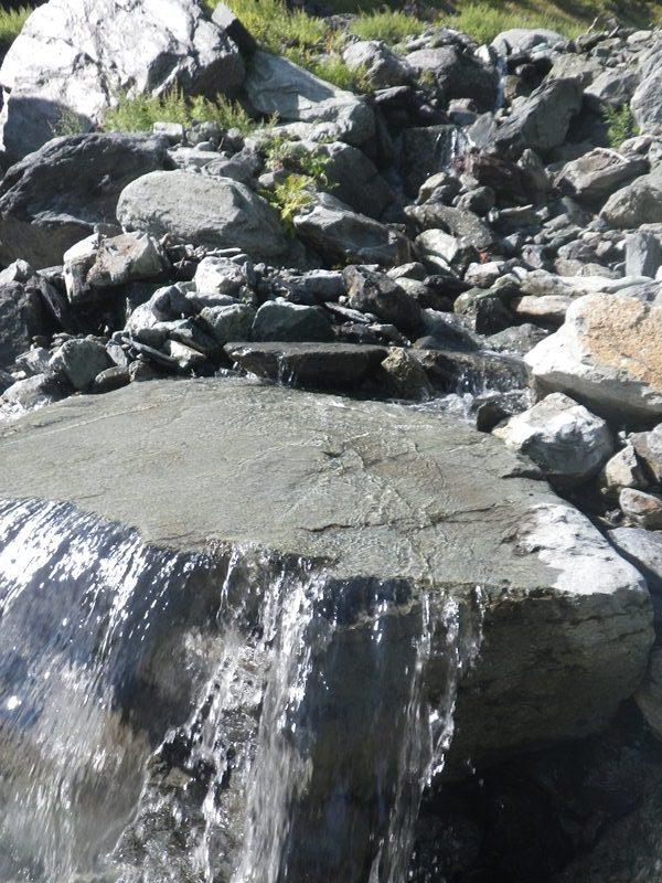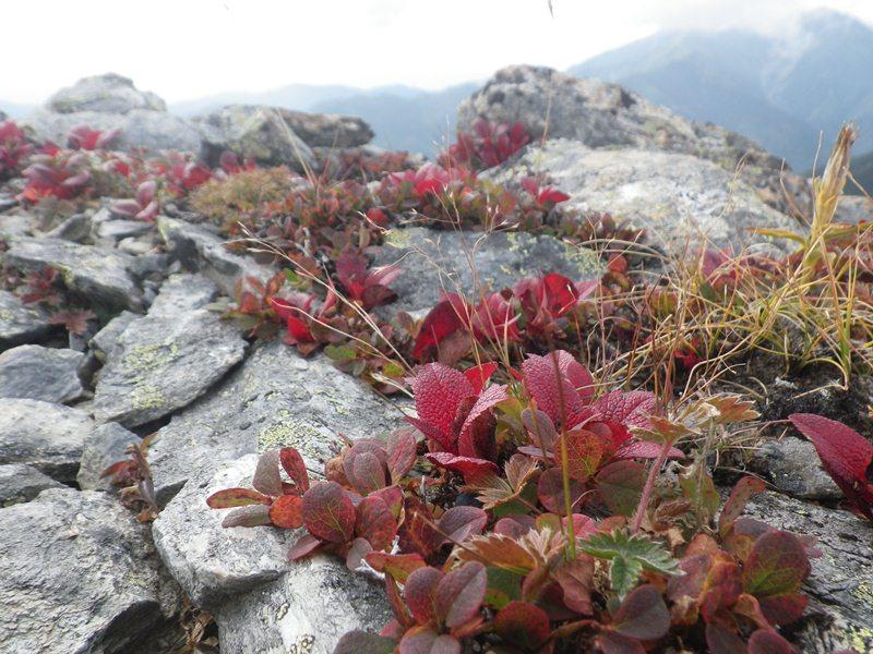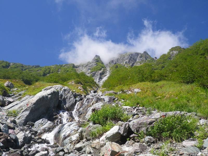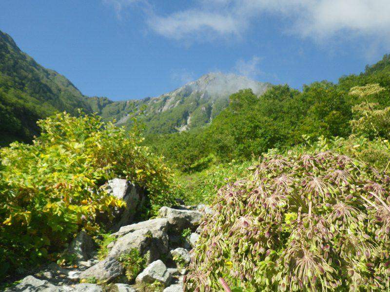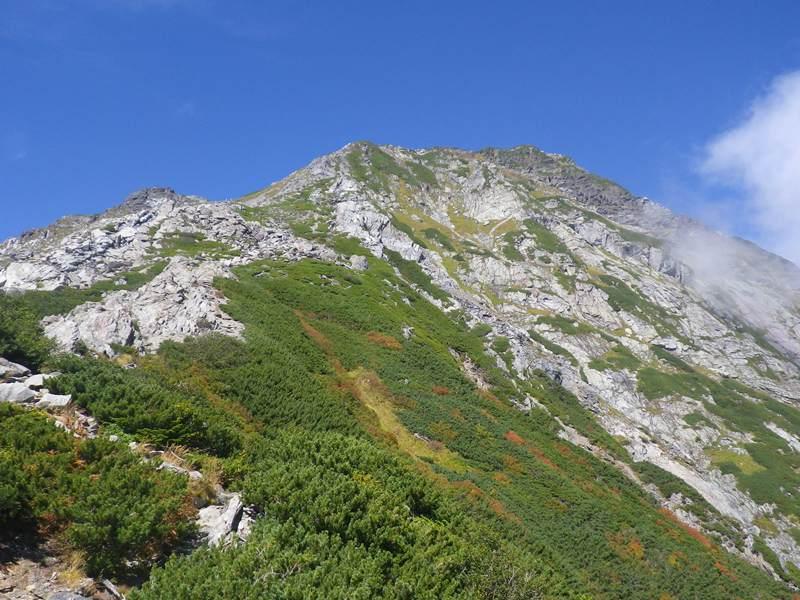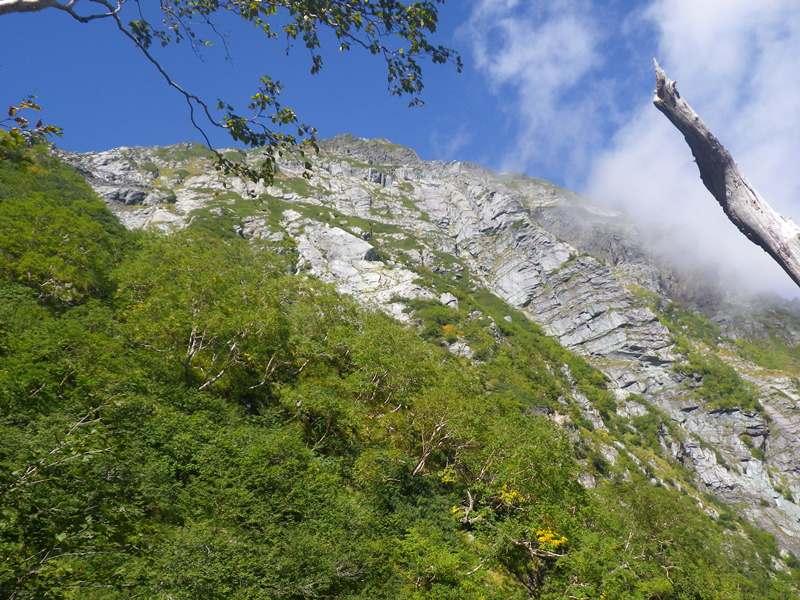 ところどころ色づき始めた草木の紅葉と空の青のおかげで、高山植物の咲き終わった道も明るく気持ちがいい。途中、バットレス沢の出会いの大岩で思わず足を止める。
