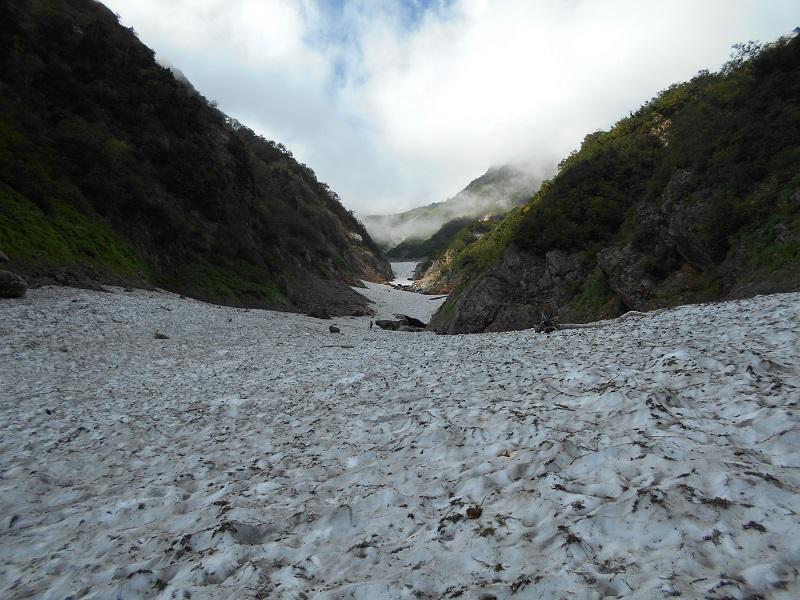 針ノ木岳の登山ルートでもある針ノ木雪渓は北アルプス三大雪渓のひとつであり、雪渓歩きが楽しめますが、この時期は状態が悪くほとんど歩くことができませんでした。