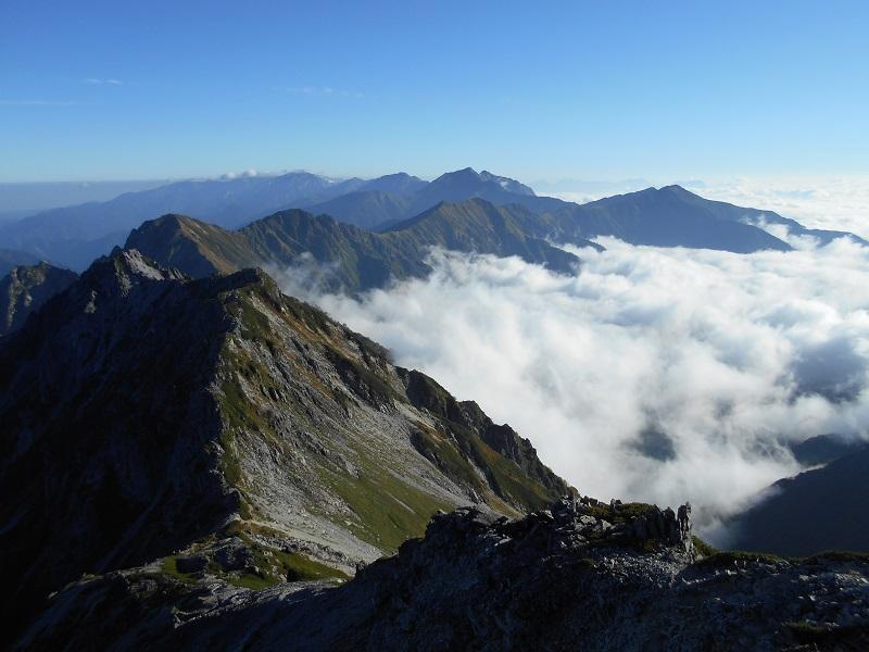 寝起きの強張った身体でまず針ノ木岳に登頂。360度の大展望でしばらく写真撮影を楽しみました。