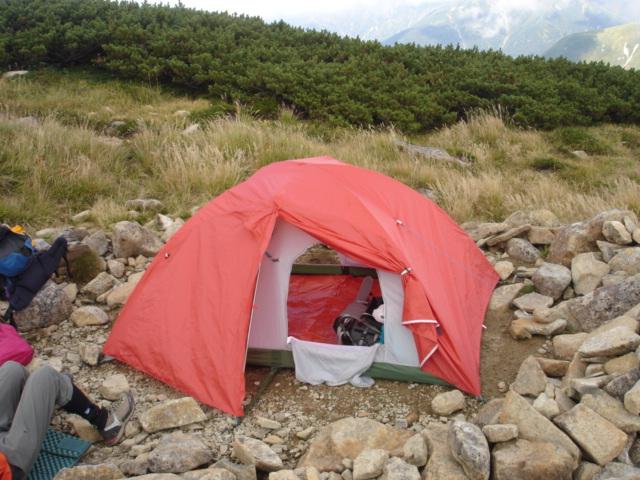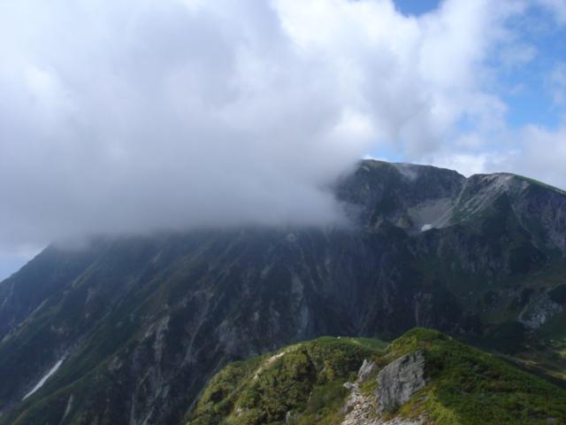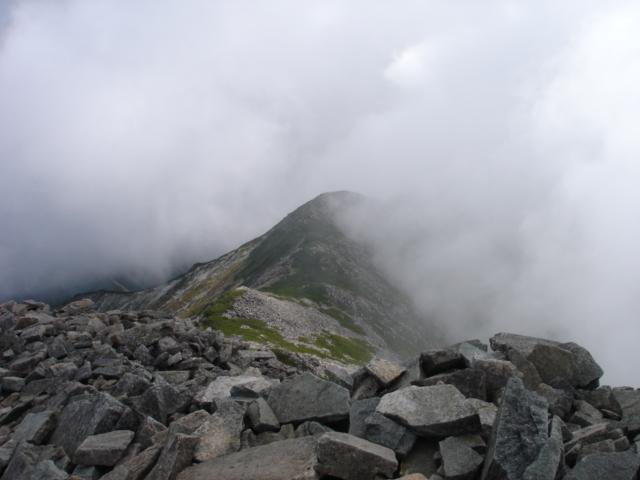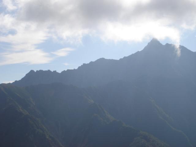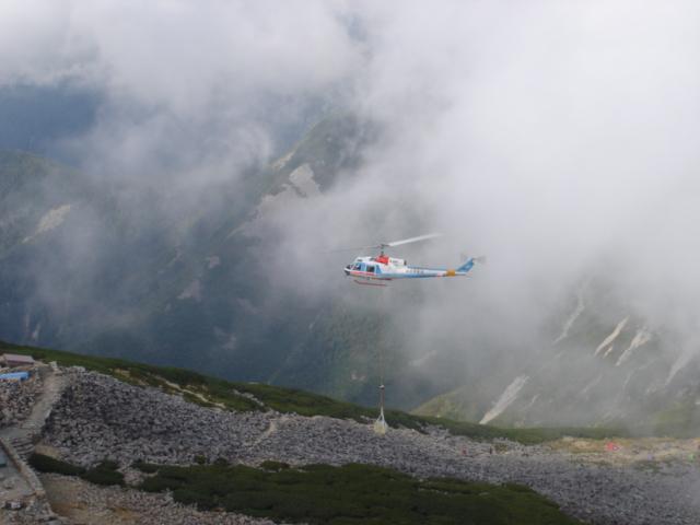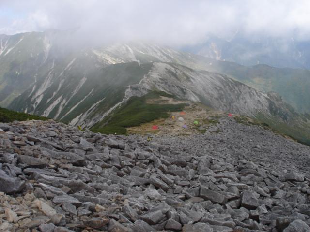 今日は待望の稜線歩き。まずは弓折乗越までの登りは快調に歩けました。続く稜線漫歩を満喫の心算が、10年前の記憶は甘すぎたようで思った以上に手こずりました。しかし、槍・穂の稜線に右手には黒部五郎から薬師岳へと続く山並みが眺望でき、振り返れば三俣蓮華、鷲羽、水晶岳と続く稜線が目を楽しませてくれます。ヘロヘロになりながらも一応予定時間で今夜の宿泊地、笠ケ岳山荘に到着できました。テント設営後山頂へごあいさつしに出掛け、小屋に荷揚げのヘリを見たりしてノンビリ過ごしました。
