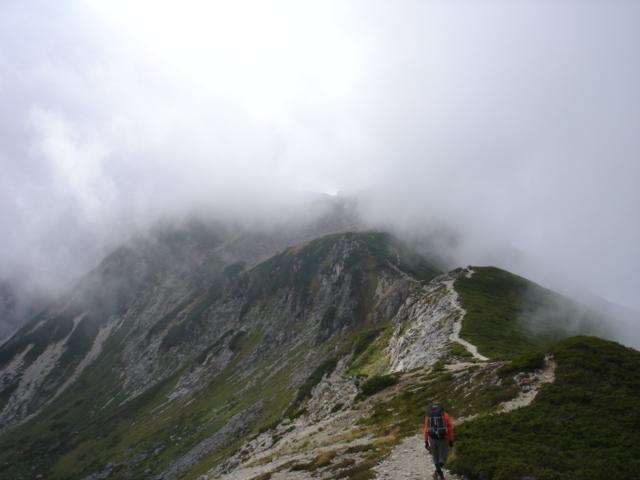- 鏡平山荘-60分-弓折乗越-30分-大ノマ乗越-100分-秩父平-100分-抜戸岳-90分-笠ケ岳山荘