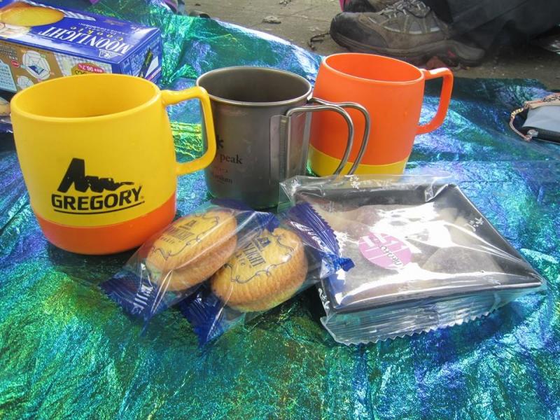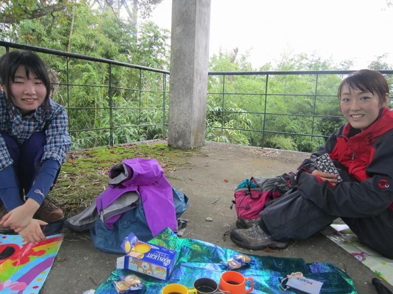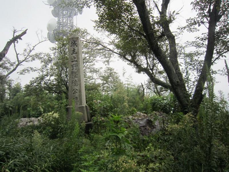 山頂は戦国時代の常山城あと 常山城主の墓、合戦で悲惨な死を遂げた女軍の供養碑などがありました。展望台が雨をしのげるので、ここでお茶タイム。山専ボトルが大活躍です。
