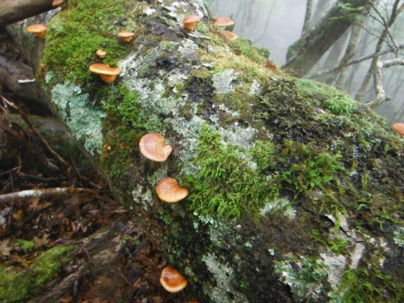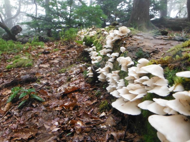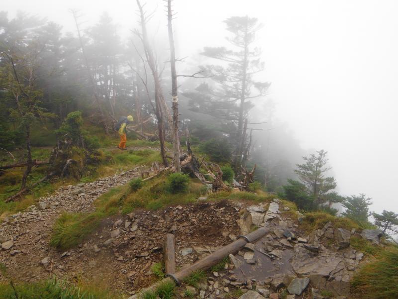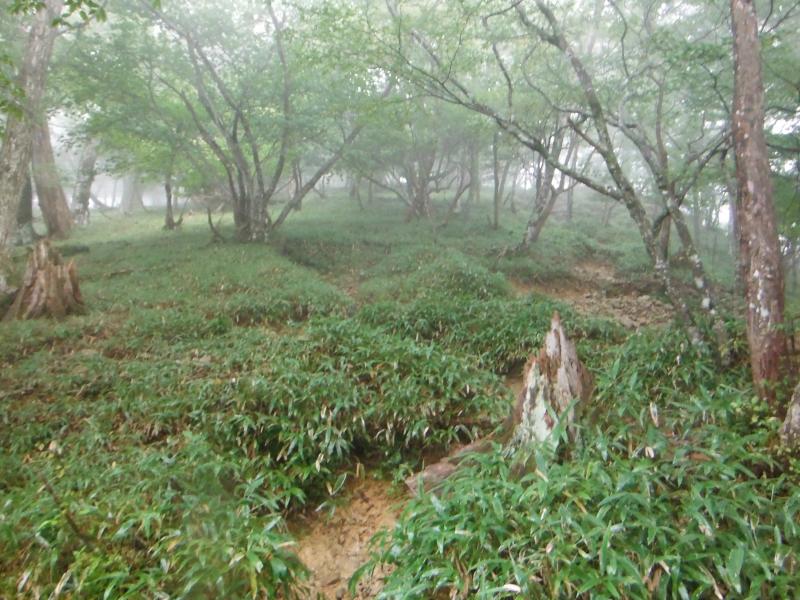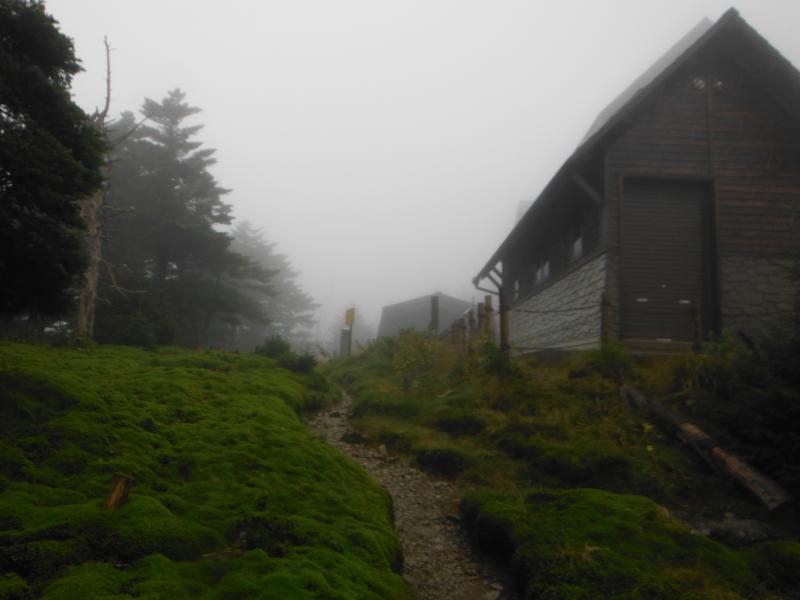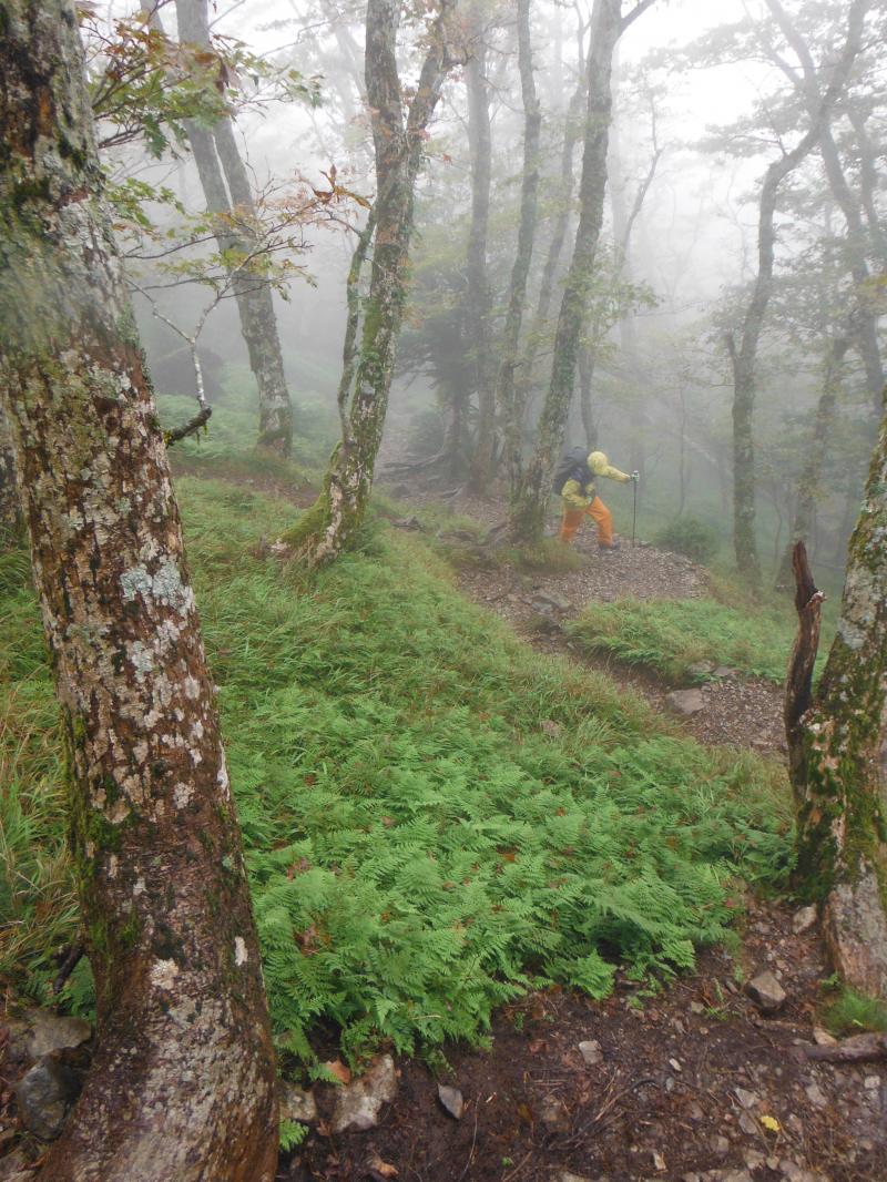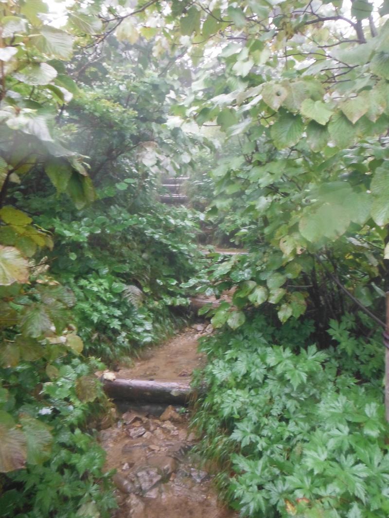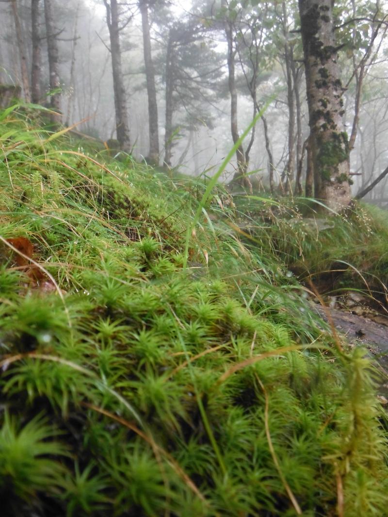 弥山小屋から八経ヶ岳の途中は鹿から樹木と植物を守るためのエリアがありますが、コケや樹木が雨に