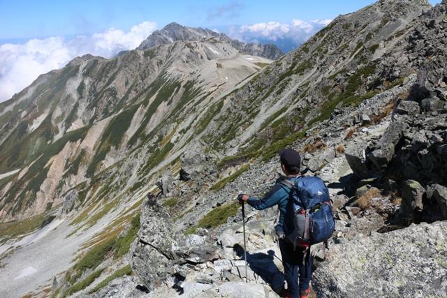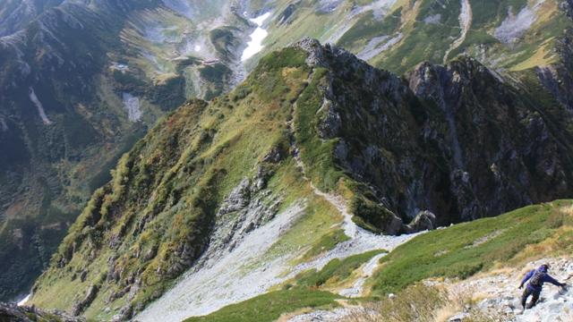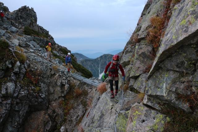 下りの核心部「カニのヨコバイ」です。トラバース手前の足元をよく見ますと