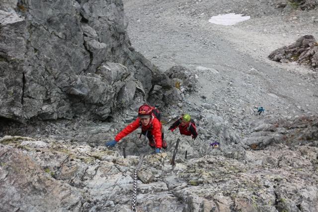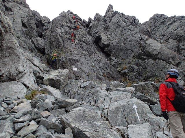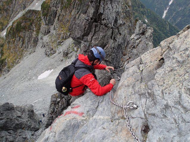 さあ、剣のぼりの核心部「カニのタテバイ」です。ほぼ直登ですが、クサリ・杭がしっかりしています。前後の登山者との間隔をあけ落ち着いて登りましょう。