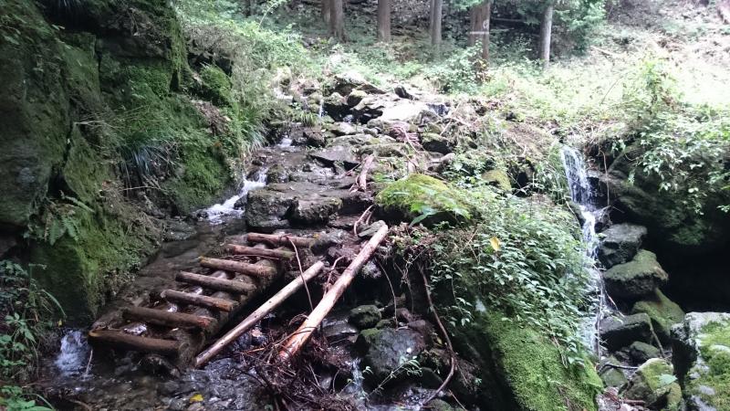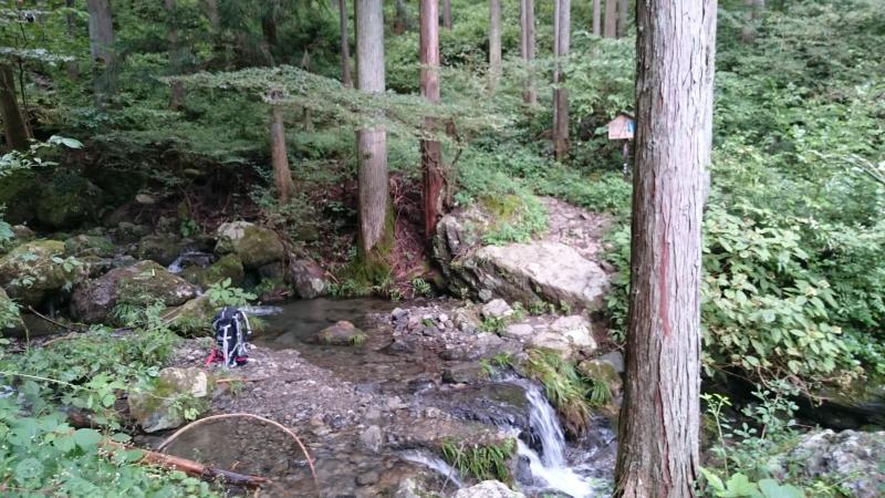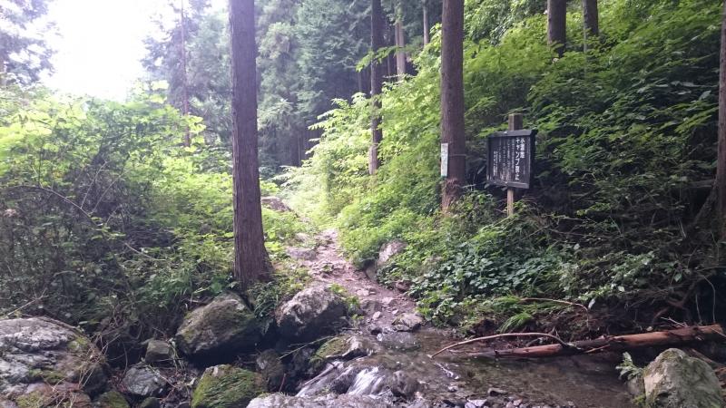 最初は沢沿いのコースを歩いて、綾滝を目指します。天狗滝にも寄り道できますが、今回は時間が無いのでパスしました。登山口から沢を渡渉します。その後も渡渉が数回あります。増水が心配されましたが、それほど増水していなかったです。