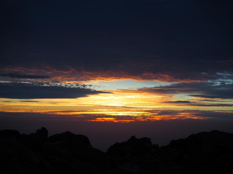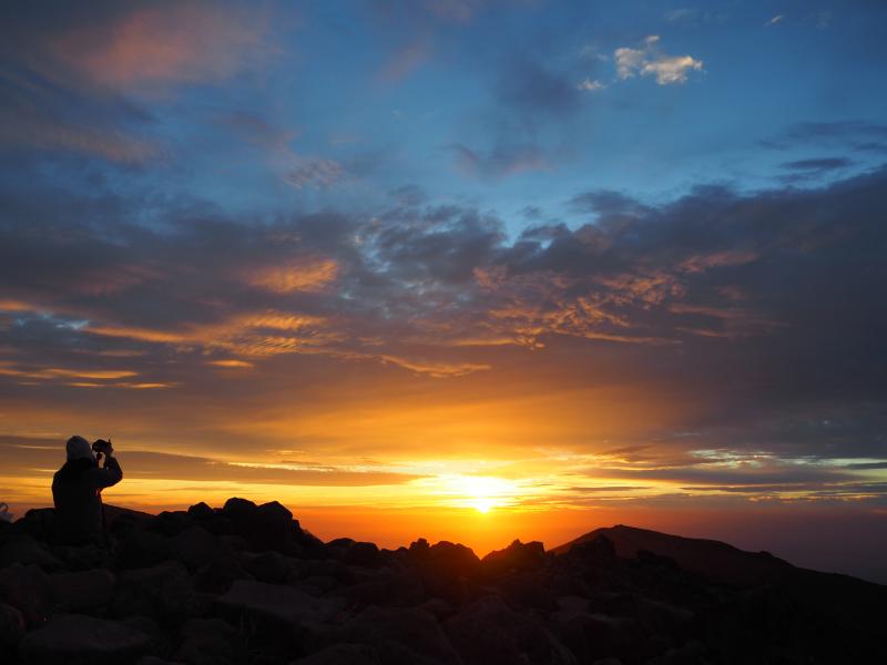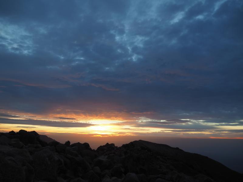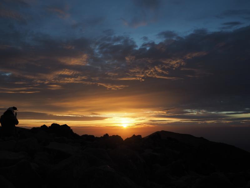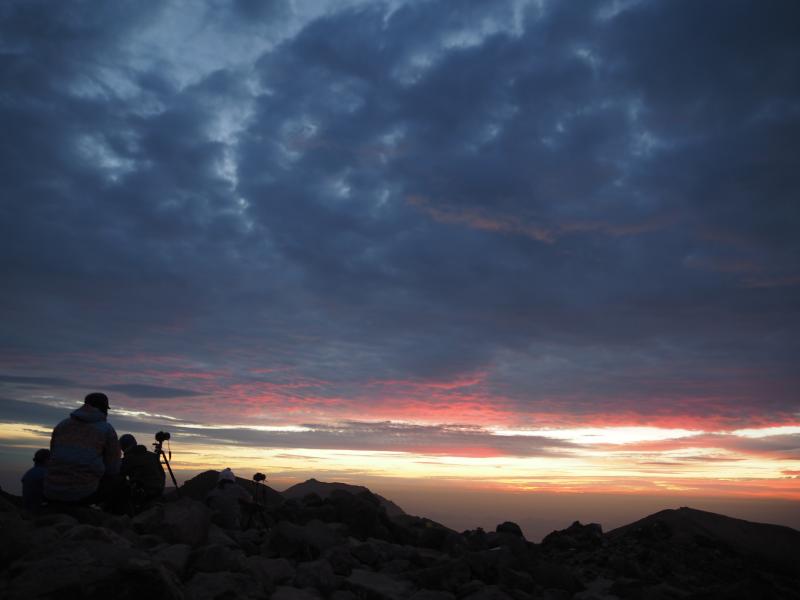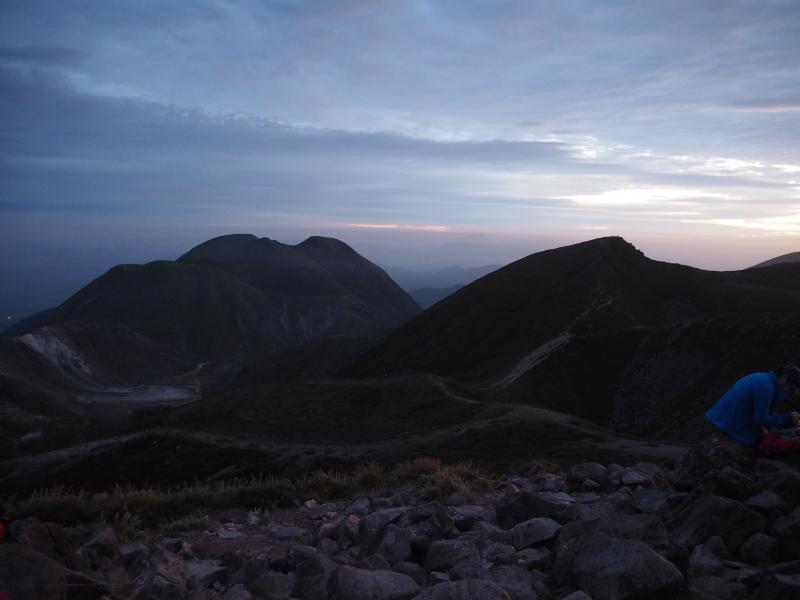 山頂までの道のりは昼間よりなんか近かった気が、、、あっという間に山頂に到着。久住山には10人程の登山者が。向かいの中岳や天狗ヶ城にもヘッドライトの明かりが見えます。日の出登山人口、多いんだなぁと改めて実感。さすがに山頂は寒くてニット帽までかぶり日の出を待ち。残念ながら今日は雲が多く完璧な日の出とはいきませんでいしたが雲が赤く染まりその隙間から太陽が登ってくるさまはやはりなんとも言えないキレイな光景でした。