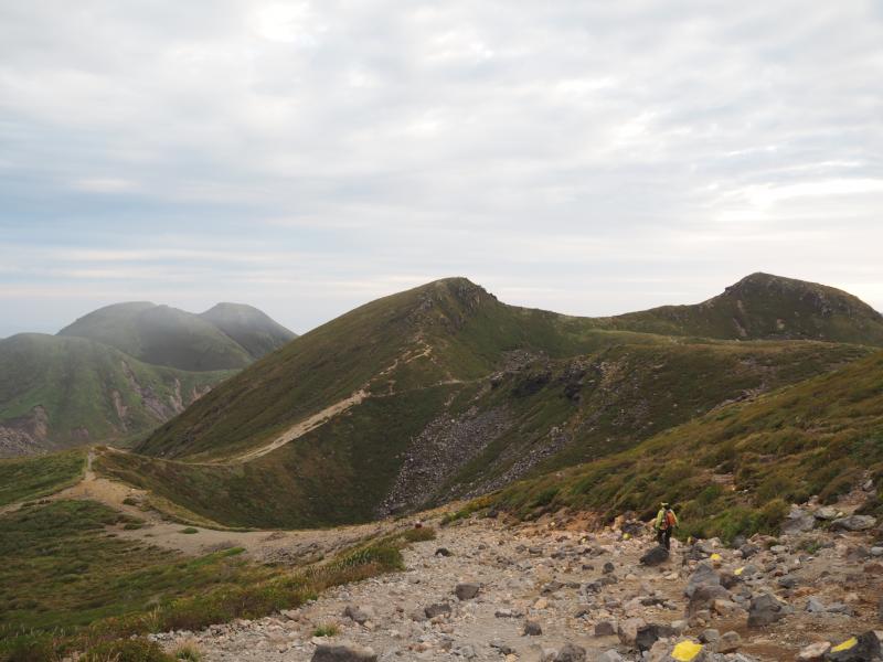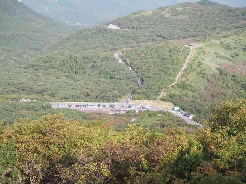 さて日の出を堪能したら帰りましょう。睡魔と戦いつつ下山開始。扇ガ鼻分岐を過ぎたあたりから登ってくる登山者が増えてきました。やはりシルバーウィーク、登山者が多いいようです。ファミリー登山の方もたくさんいました。駐車場まで下りてくると車が路肩までびっしり」!!こんな混んでいる久住山は初めて。びっくりでした。